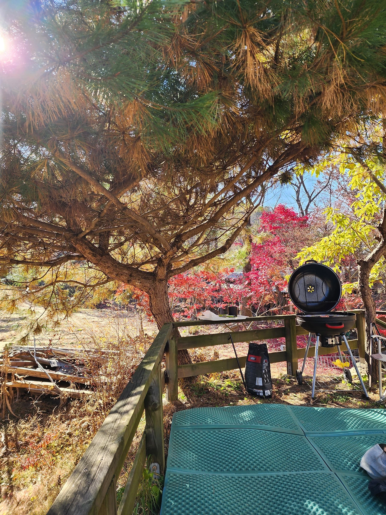 아이들은 나무 막대기를 들고 칼싸움을 하고 자전거를 타다가도 고기 냄새에 킁킁거리며 아빠 주위를 계속 맴돈다. 밖에서 굽는 고기는 시간이 필요해. 느긋하게 가을 풍경을 즐긴다.