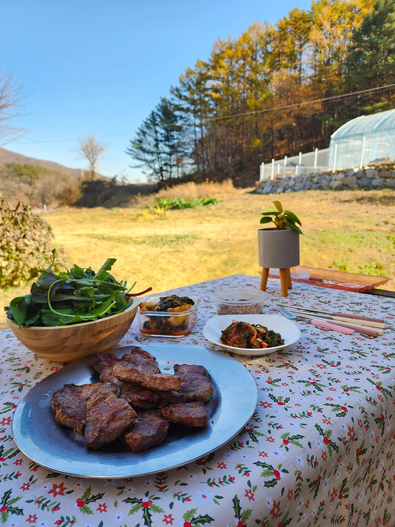 평소엔 방치해 뒀던 나무 벤치에 식탁보를 펼치고 단출한 음식을 세팅한다. 웃고 떠들며 너 한 입, 나 한 입 먹다 보면 고기는 금세 감쪽같이 사라진다. 사랑은 곱절로 피어난다.