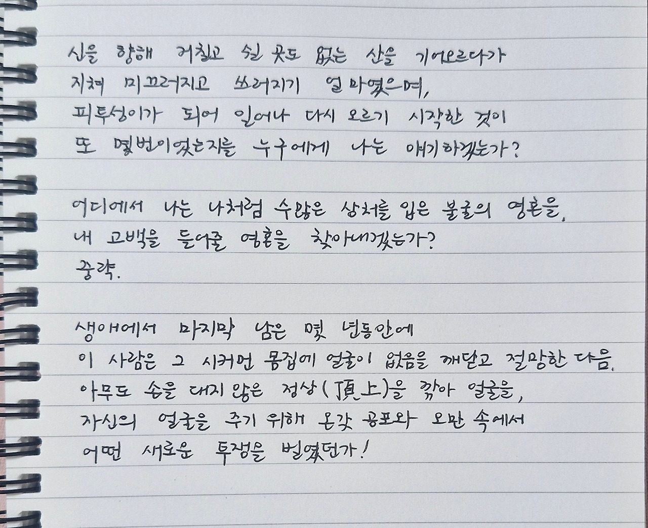 신을 향해 거칠고 쉴 곳도 없는 산을 기어오르다가 지쳐 미끄러지고 쓰러지기 얼마였으며, 피투성이가 되어 일어나 다시 오르기 시작한 것이 또 몇 번이었는지를 누구에게 나는 얘기하겠는가?