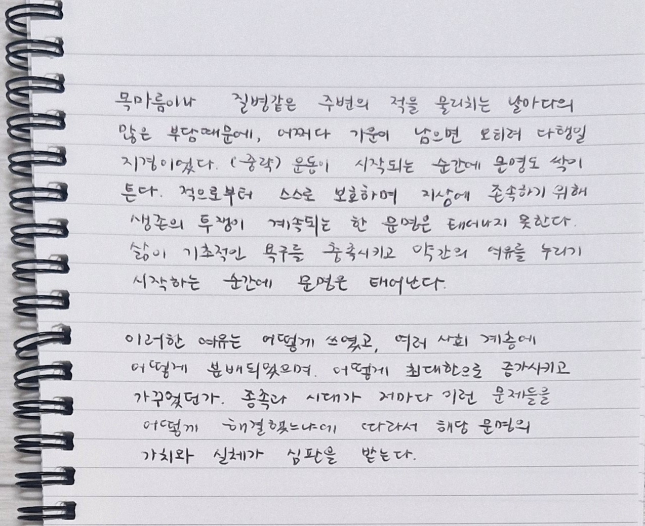 운동이 시작되는 순간에 문명도 싹이 튼다. 적으로부터 스스로 보호하며 지상에 존속하기 위해 생존의 투쟁이 계속되는 한 문명은 태어나지 못한다. 삶이 기초적인 욕구를 충족시키고 약간의 여유를 누리기 시작하는 순간에 문명은 태어난다.