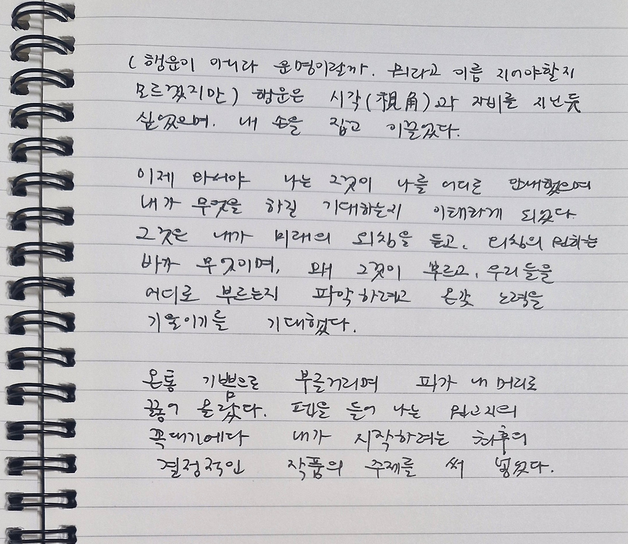 온통 기쁨으로 부글거리며 피가 내 머리로 끓어올랐다. 펜을 들어 나는 원고지의 꼭대기에다 내가 시작하려는 최후의 결정적인 작품의 주제를 써넣었다.