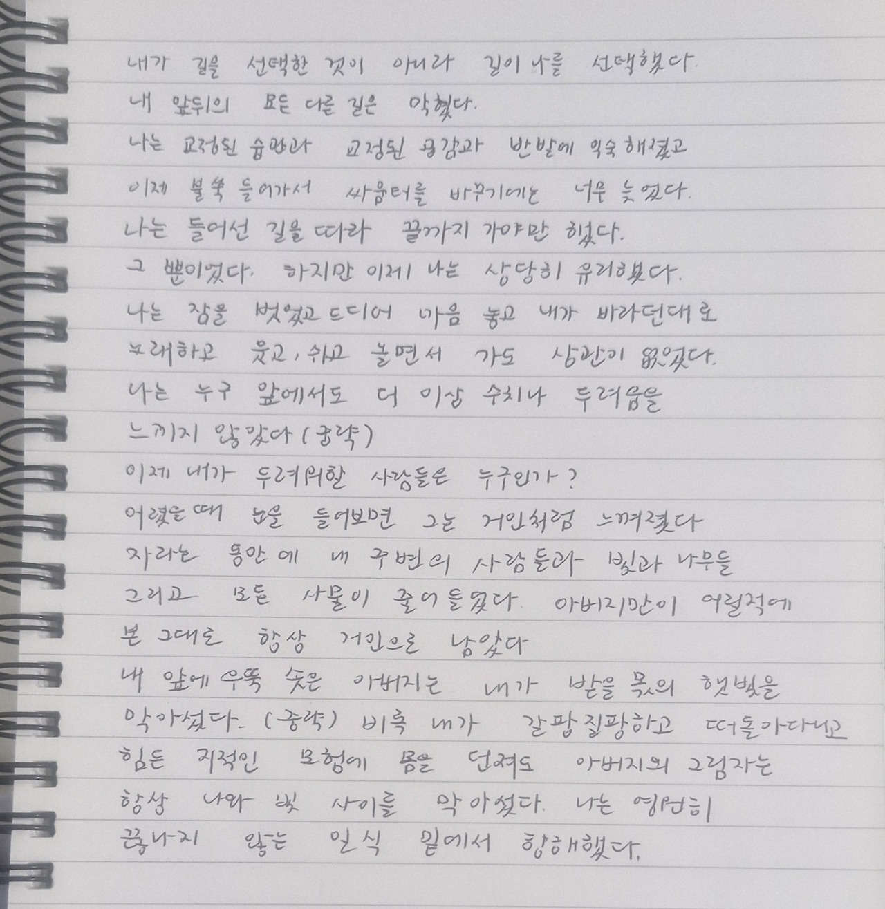 내가 길을 선택한 것이 아니라, 길이 나를 선택했다. 내 앞뒤의 모든 다른 길은 막혔다.