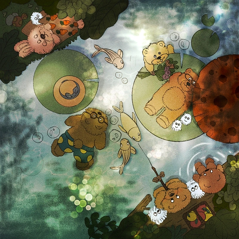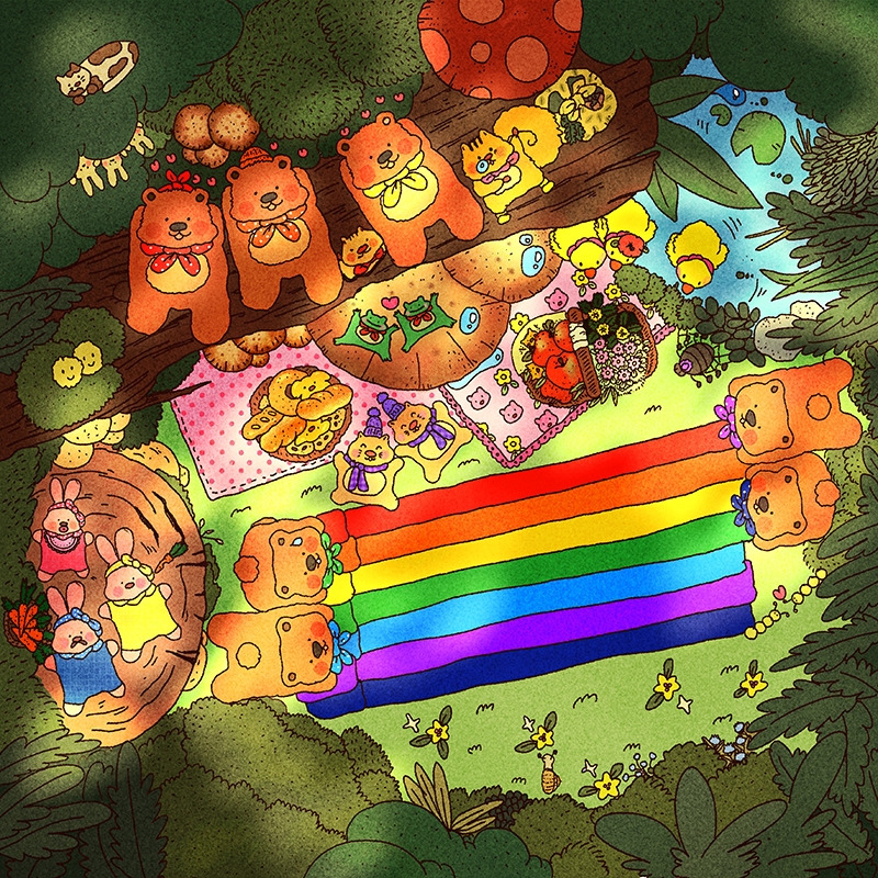 지금도 상상을 좋아하는 어른이 되었다. 그림책을 매번 하나씩 하나씩 사 모은다. 채워지는 책장을 볼 때면,입가에 미소가 따라오고 흐뭇해진다. 결국 상상으로 주체가 되지 않는지 그림으로 그리기 시작했다. 눈, 마음, 손이 반짝반짝 분주하게 움직인다. 머릿속으로 떠올려보던 동물들이 번쩍번쩍 마법을 부린다. 별을 낚시하고, 구름으로 솜사탕을 만든다. 보름달로 만든 아이스크림을 들고 하늘을 여행한다. 자연의 요정들이 꽃을 보살핀다. 썩은 나무 밑동 아래에는 옹기종기 요정 마을이 있다.