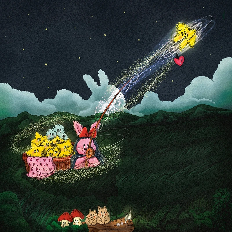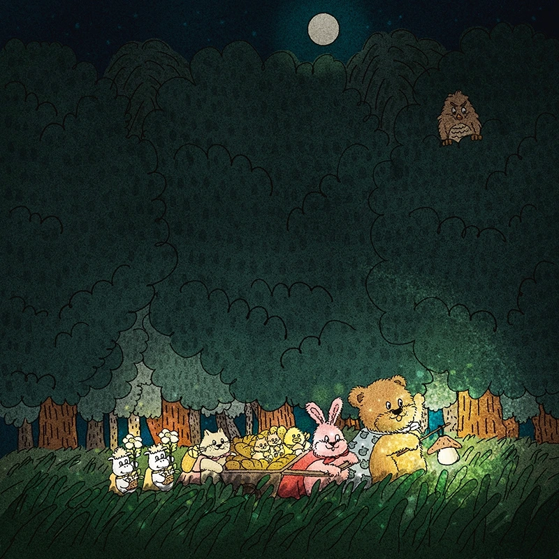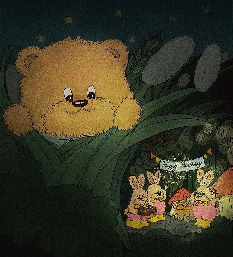어두운 밤 풀 숲의 토끼 요정들의 파티를 몰래 훔쳐보는 곰돌이가 있다.