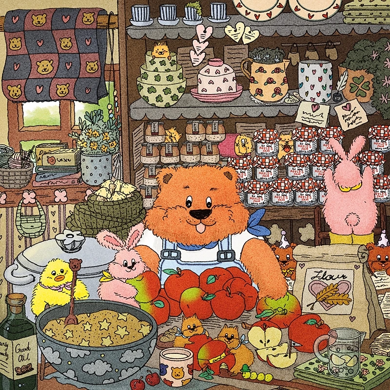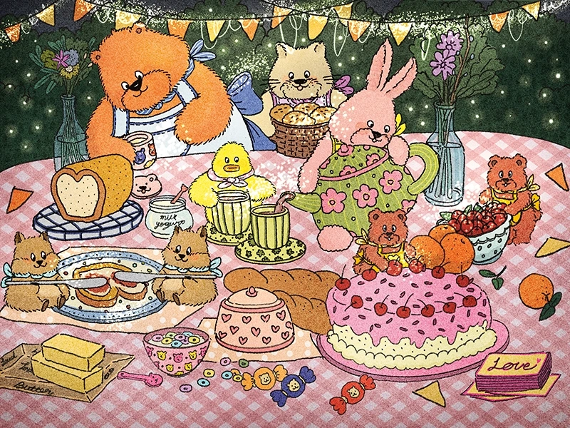 따뜻하고 달달한 밀크티를 준비한다. 고소한 냄새가 가득한 빵도 잔뜩 있다. 서로서로 도와 핑크색의 체리 케이크를 만든다. 딸기맛의 잼과 버터도 발라 맛있는 식빵과 우유 크림 요구르트, 알록달록 곰돌이 사탕도 여기저기 놓여있다. 모두들 파티 준비로 행복하다.