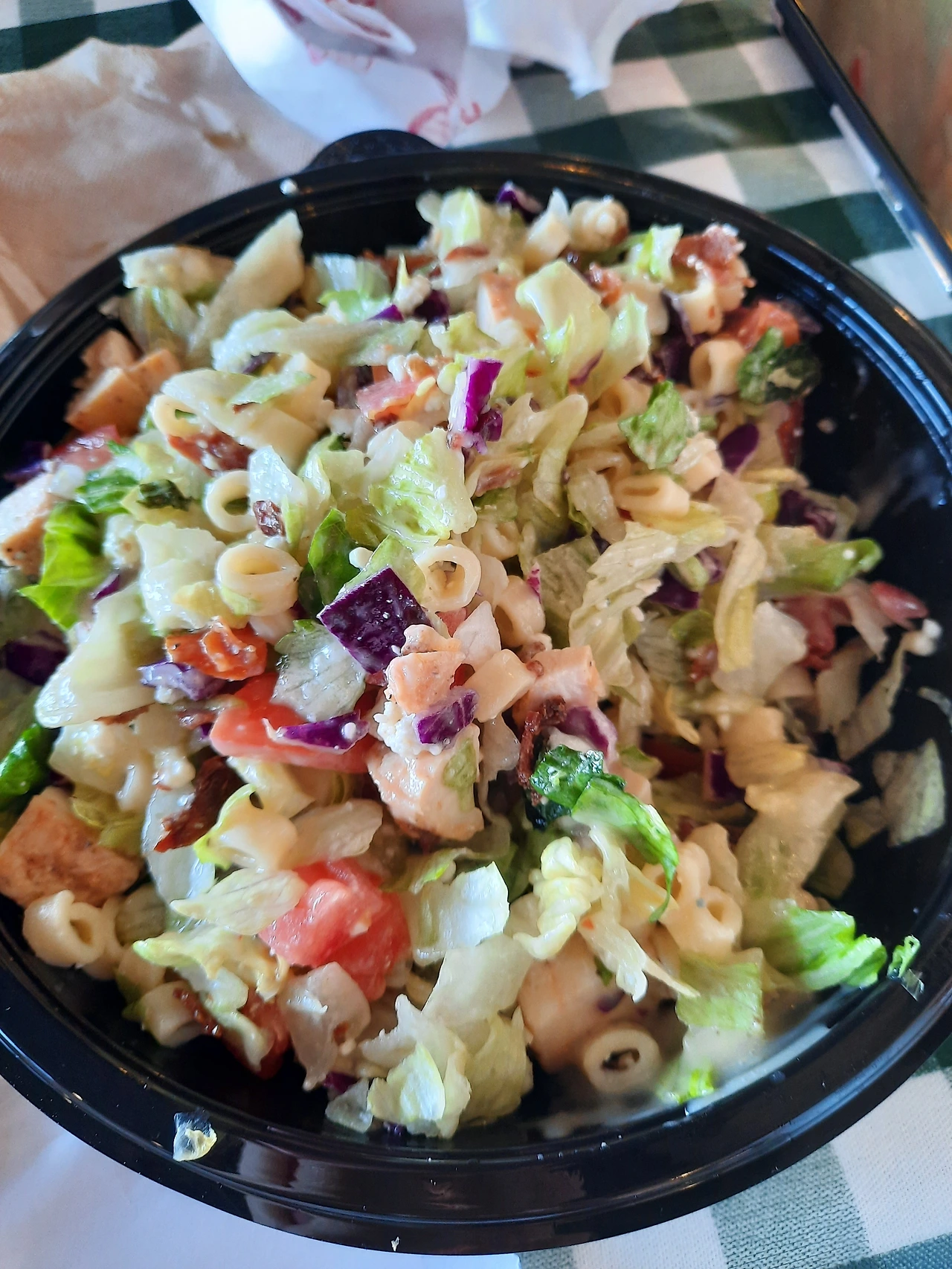아이의 핫도그엔 토마토와 잘게 다진 피클만 올리고 남편과 나는 모든 재료를 다 올린다. 핫도그 하나로 부족한 양은 샐러드로 채운다. 우리가 가장 좋아하는 샐러드는 찹 샐러드(chopped salad). 모든 재료가 쫑쫑 썰려있어 퍼먹기에 좋다. 처음 시켰을 때 느낀 맵싸함이 있었는데 알고 보니 파였다. 샐러드에 파라니. 나에겐 생소한 느낌이었다. 느끼할 수 있는 샐러드드레싱을 파가 훅훅 떨쳐내 준다. 너무 매워지기 전에 블루치즈의 콤콤함이 매운 기를 덜어준다.