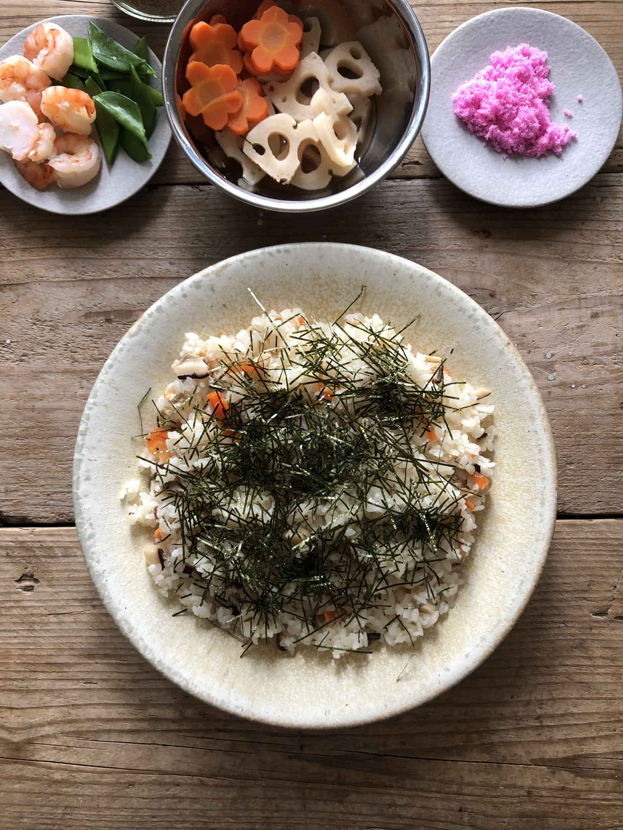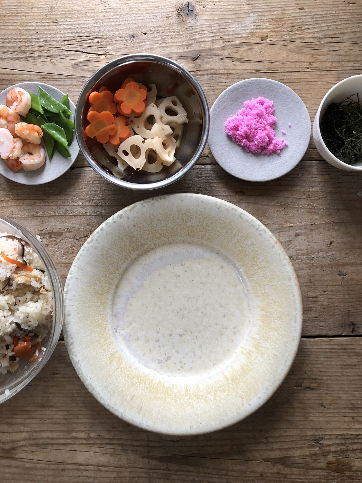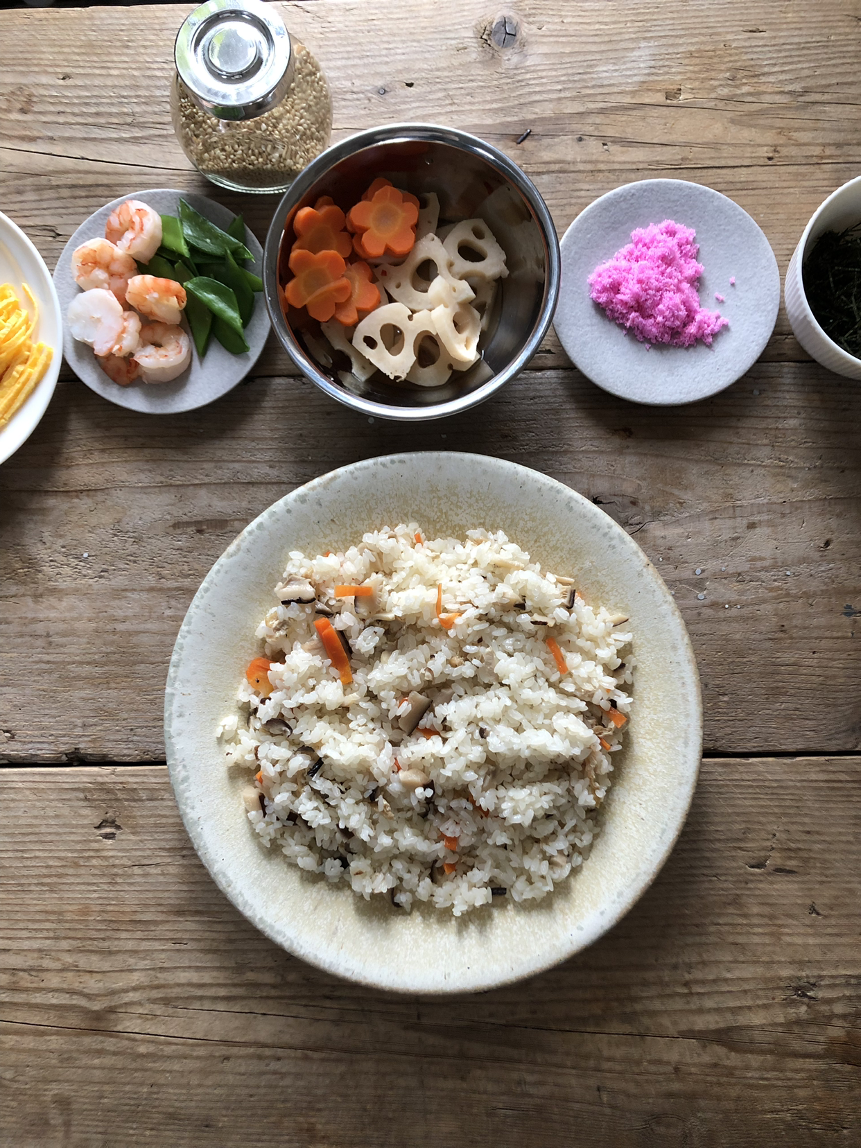 위에 올릴 고명은 김, 새우, 완두콩, 당근, 연근, 사쿠라덴부, 날치알, 지단, 참깨.