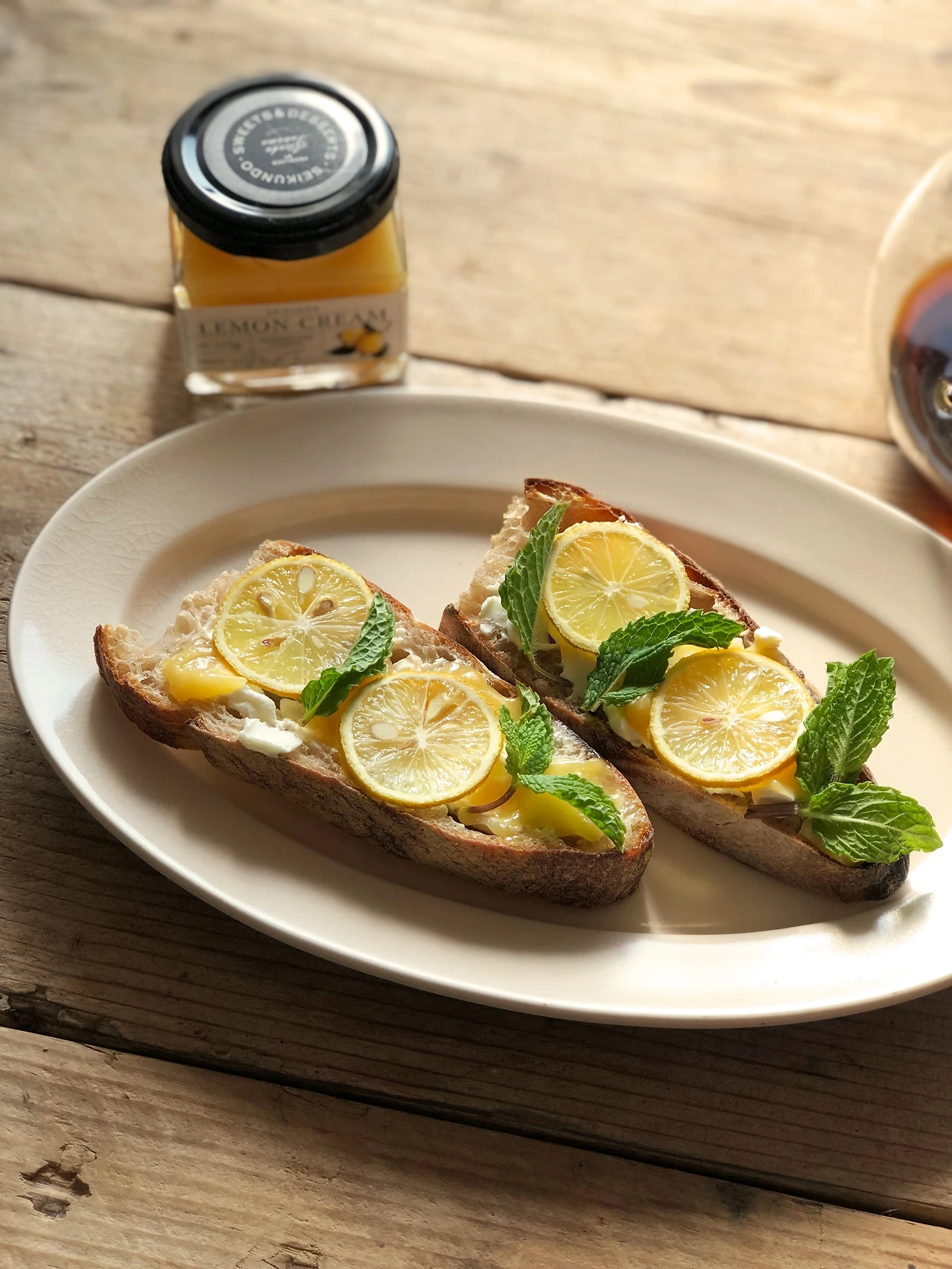 통밀빵 위에 크림치즈를 바르고 그 위에 레몬 버터크림