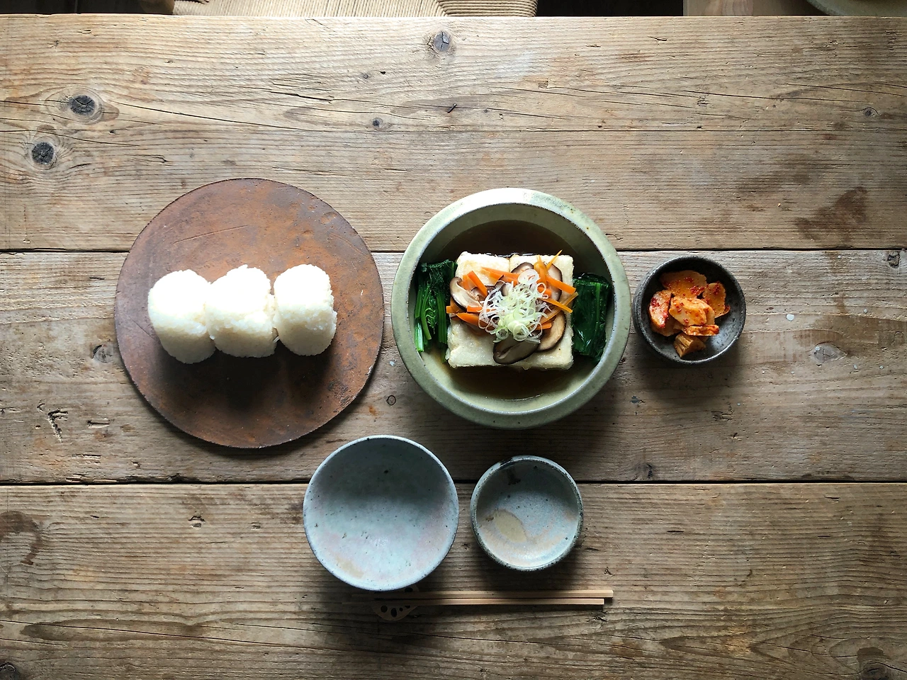 あんかけ揚げ豆腐(두부요리), 塩おにぎり(소금 주먹밥), 단무지, 된장국이 오늘의 아침메뉴이다.