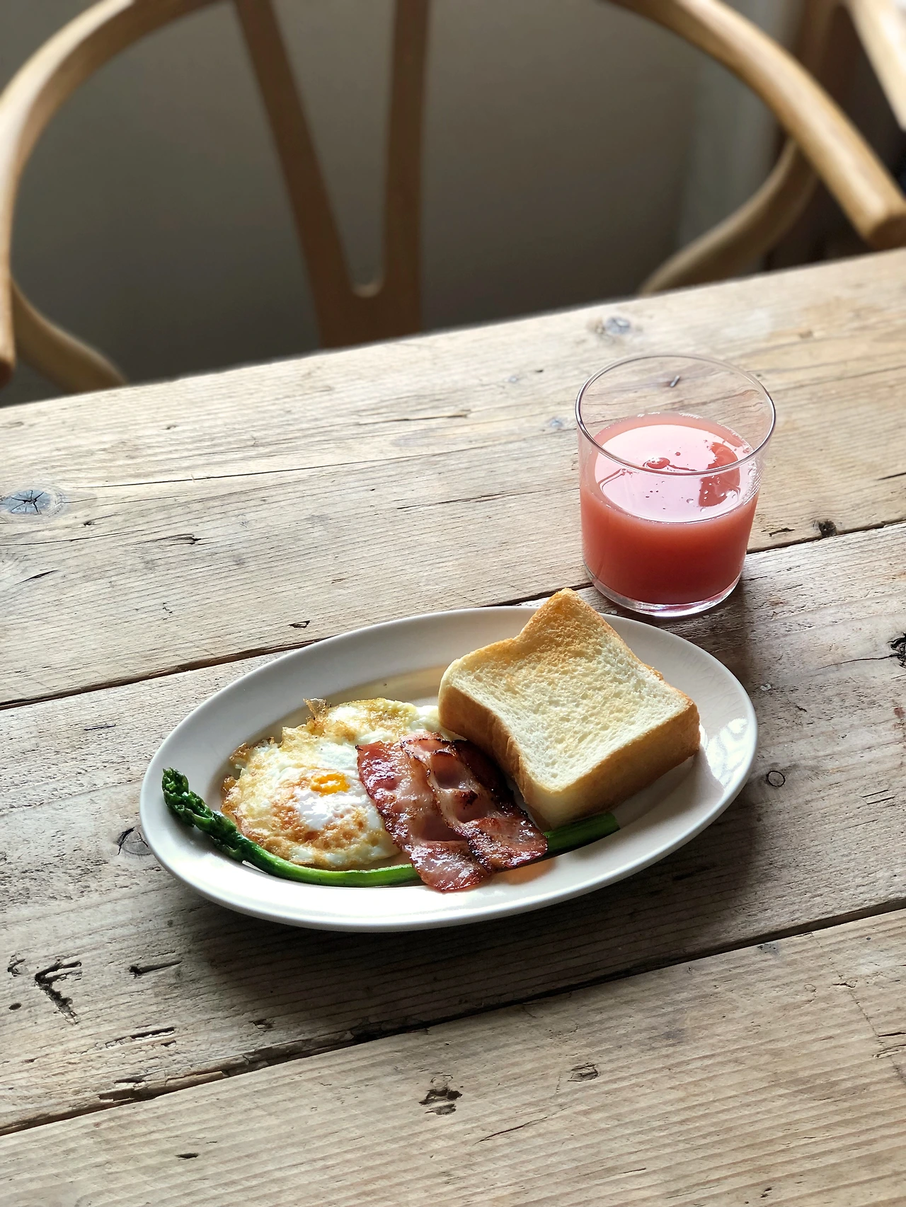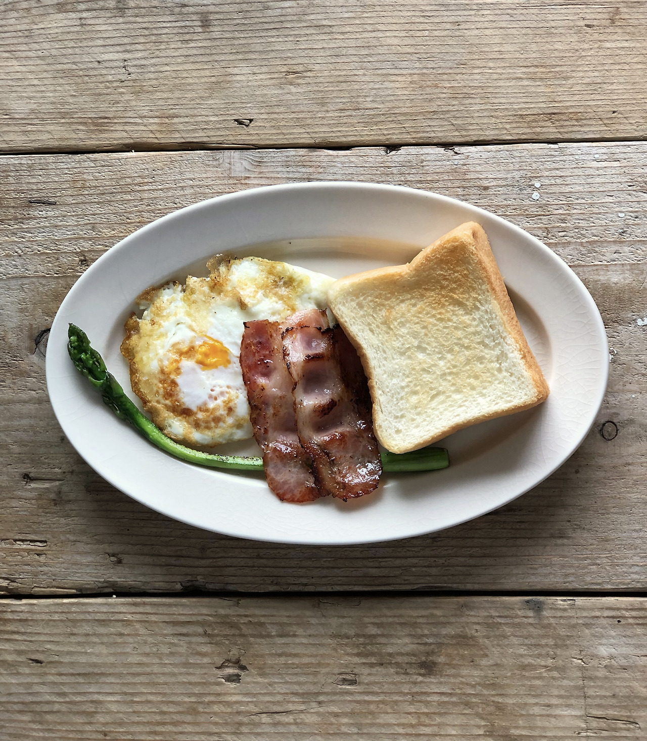 계란 프라이, 구운 아스파라거스, 베이컨 그리고 미니 식빵