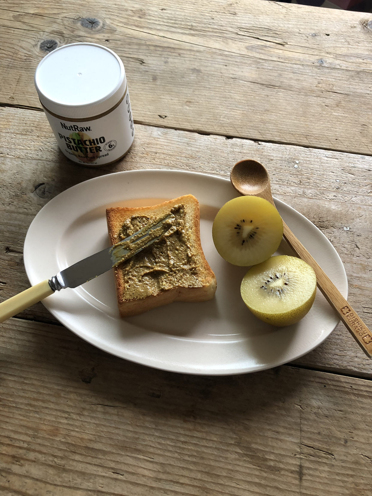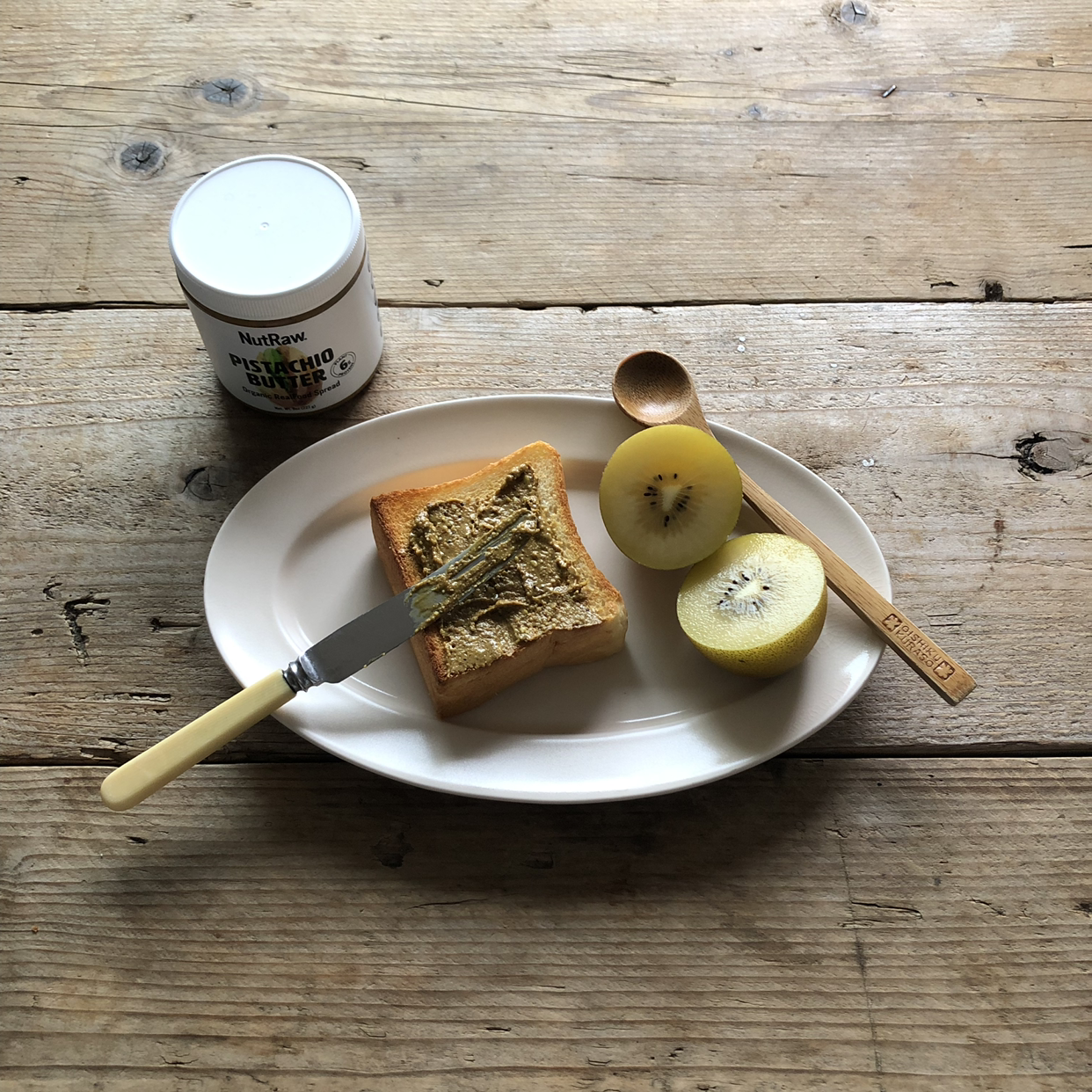 또 다른 평일 아침 내가 좋아하는 미니 식빵과 뉴욕에서 사 온 피스타치오 버터 그리고 골든키위