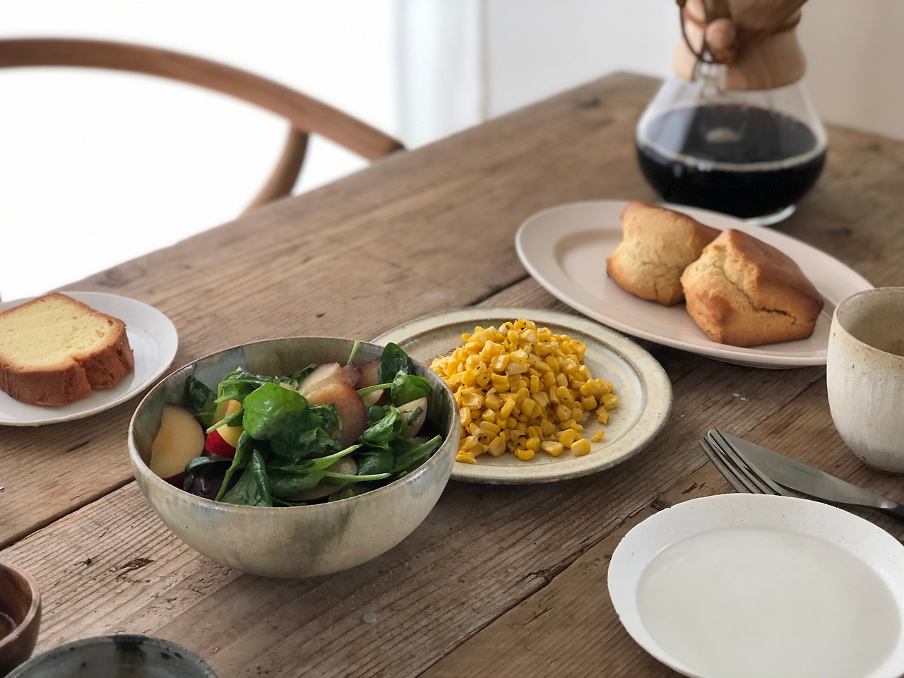 스콘 두 개, 자두 샐러드 , 초당옥수수 , 작은 파운드케이크 그리고 핸드드립 커피.