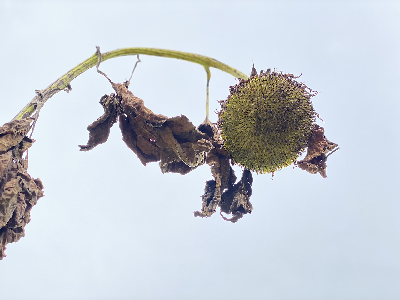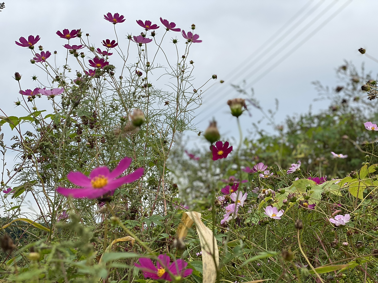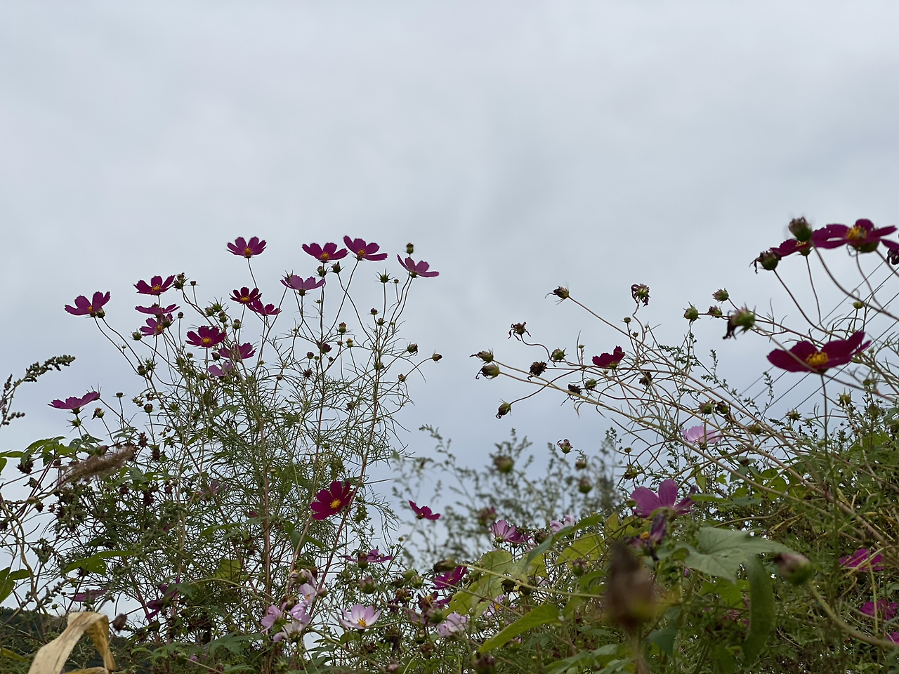 태양을 흠모하다 그 열기에 타서 말라 버린 해바라기와 삼색 치마를 입고 흔들고 있는 코스모스가 피어있는 길을 따라 내려간다.