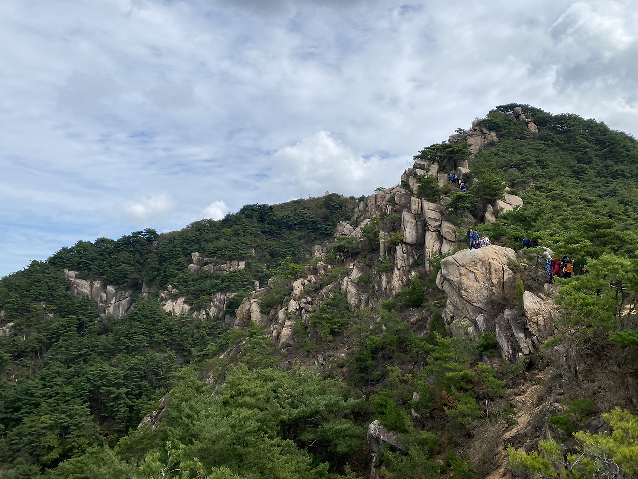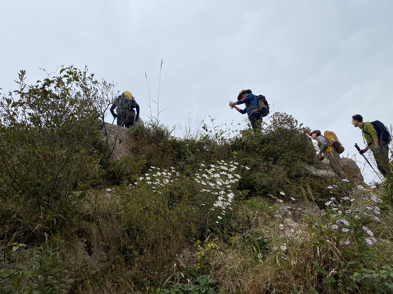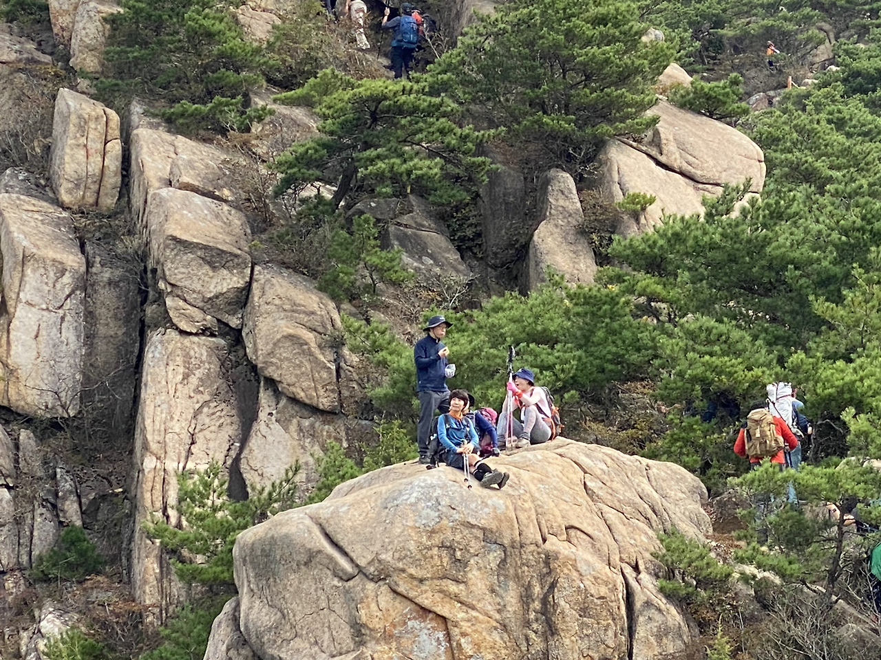 한 무리의 등산객들이 산등성이 곳곳에 놓인 멋진 바위마다 자리를 잡고 포즈를 취하고 있다.