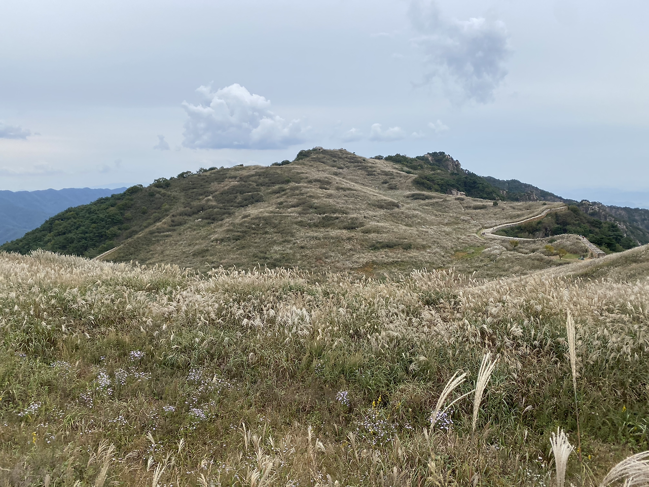 정상이다. 757m 정상에서 아래를 내려다보니 산성과 분지를 가득 채우며 바람에 일렁이는 은빛 억새물결이 햇빛 좋은 날 너른 호수의 물결에 비친 윤슬 같다.
