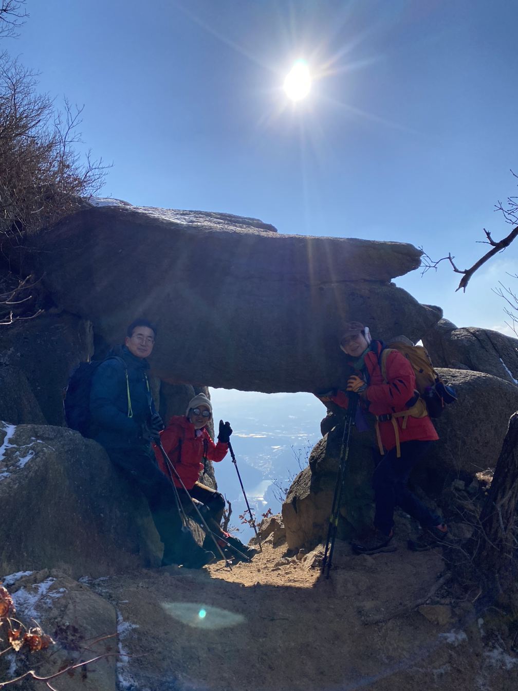 이번 산행에는 봉금누님의 대형쉘터가 히트다. 봉금파 대원들이 그 속으로 자리 잡았고, 초대된 몇 회원도 쉘터 덕분에 따뜻하고 여유 있는 점심을 즐겼다는 후일담도 전해 들었다.(내가 가진 비닐쉘터는 이제 버려야겠다 ㅠ.ㅠ)
