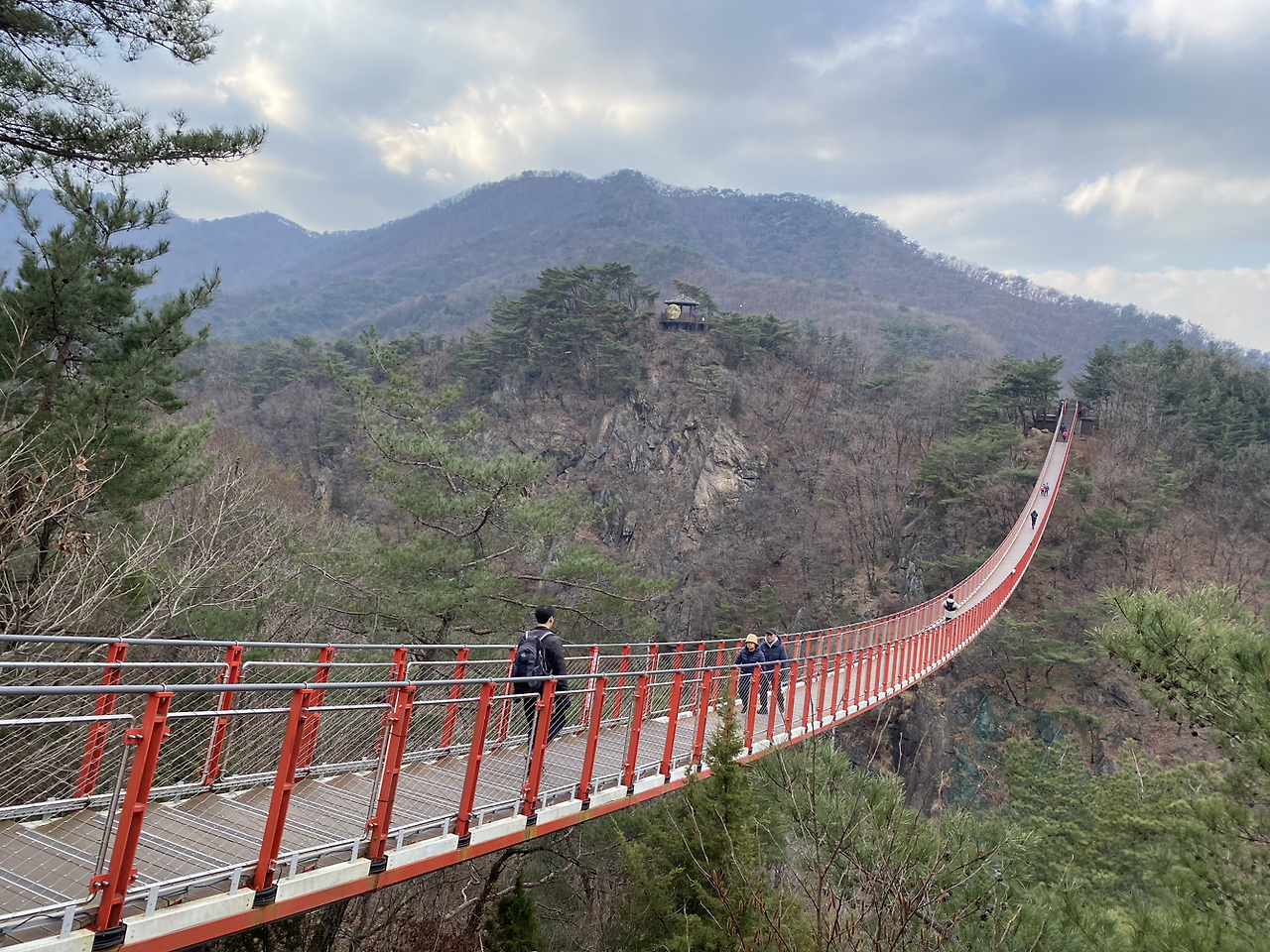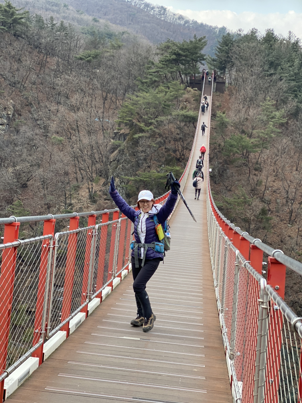 장군님의 영도 아래 능선계곡길을 따라 출렁다리까지 편안히 내려왔다. 올라갈 때 구름을 밟듯 사뿐사뿐 튕겼던 흔들림은 내려올 때는 학다리 덩실거림으로 바뀌었다.