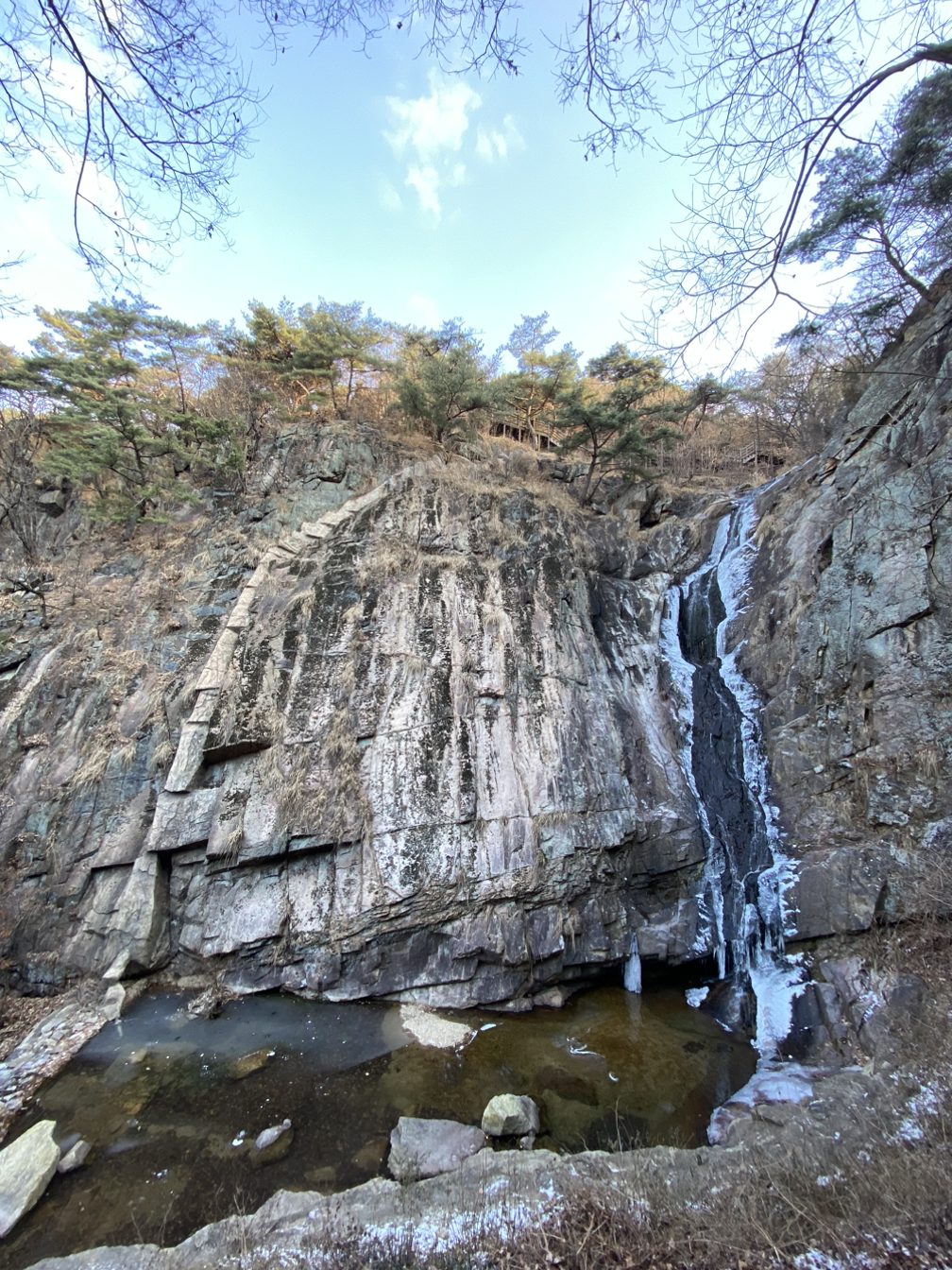 구름을 밟고 딛는 듯이 튕기듯 공중 다리를 사뿐사뿐 건너서 언덕을 올라서니 호랑이 담배 먹든 시절을 만난 듯이 신선의 세계로 들어선 느낌이 들었다. 신선이 범을 타고 다녔을 법한 이곳에 자리를 잡아 이름이 된 듯한 범륜사를 스치듯 지나니 흑룡 한 마리가 연못에서 승천할 듯이 하얀 날개를 펴고 승천을 할 준비를 하고 있다. 운계폭포이다. 비룡폭포라고도 불리는 이유가 있다. 사람들의 상상력이 대단하다.