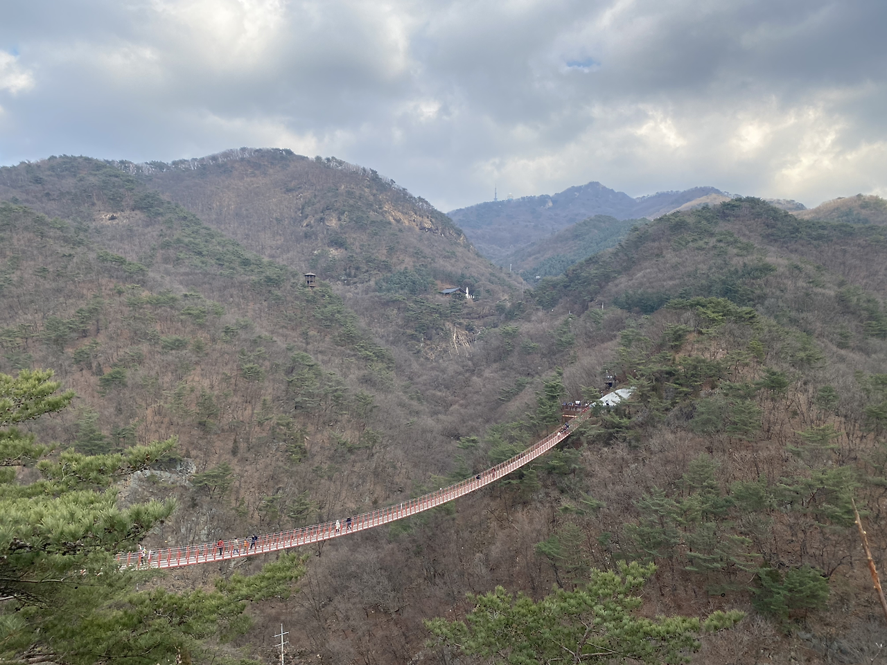 감악산 출렁다리는 설마리 계곡을 연결한 제법 긴 현수교로 잿빛 숲 속을 가로지르는 빨간 다리가 예뻐서 명소로 알려져 있다 한다. 어느 편 에세이에 지자체마다 출렁다리를 만들어서라고......... 비아냥거렸었는데,