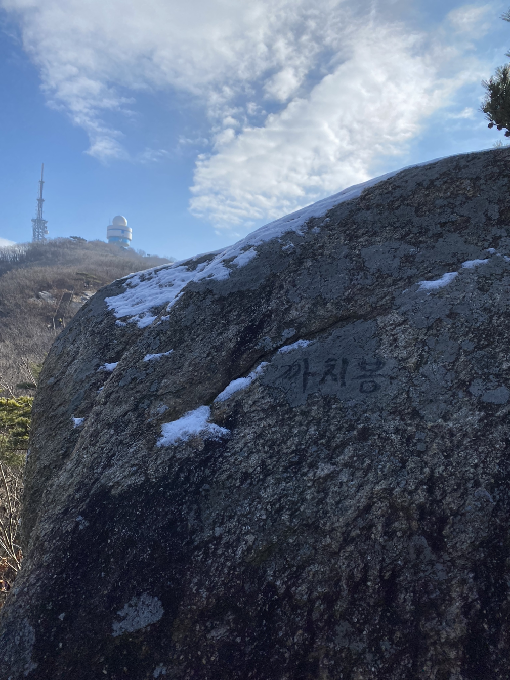 정돈이 잘 된 운계능선길을 따라 1시간쯤 올라오니 멀리 기상관측소 같은 것이 보여 잠시 멈췄는데, 여기가 까치봉이란다. 먼저 온 이가 가리키는 곳을 보니 커다란 바위에 어떤 이가 까만 글씨로 정성스레 써 놓았다. 동네에서 까치집들도 눈여겨 찾지 않으면 발견할 수 없더니만 모르고 지나치는 등산객을 위해 배려차원에서 써 놓은 것 같다.