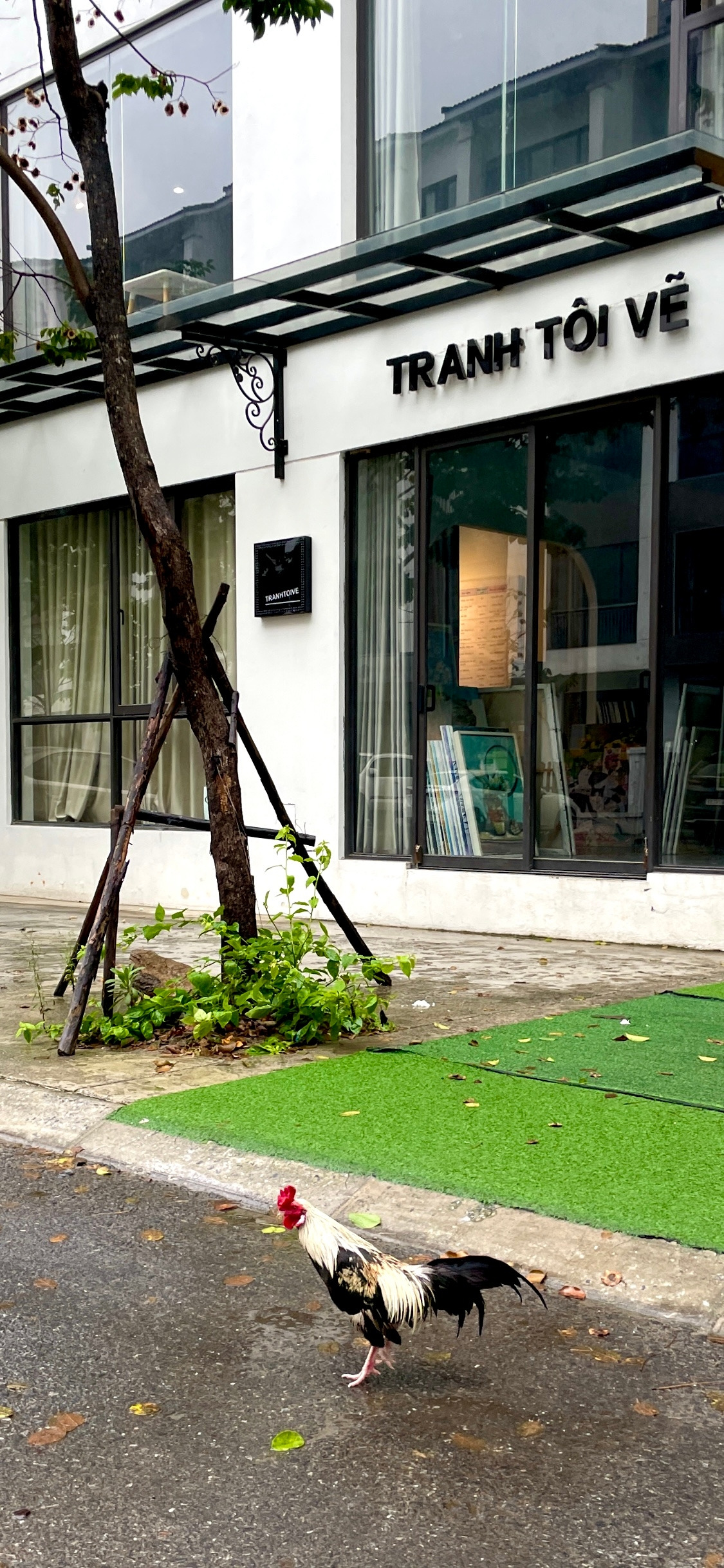 패셔너블한 닭 한 마리가 정처 없이 걷고 있다