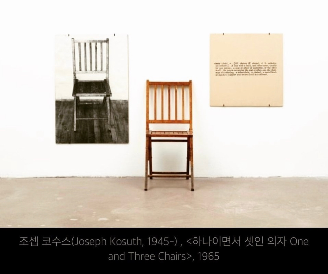 조셉 코수스의 작품은 고작 몇 초 동안 작품을 바라보고는 이게 예술이면 나도 하겠다라고 말하는 미술관 관객들에게, 2차원 공간에서는 보이지 않는 것에 대한 암시의 형태로 작품을 모방한 사진과, ‘Chair’라는 단어의 의미론적 함의를 풍부하게 하기 위해 텍스트를 시각적 이미지와 함께 배치함으로써 무엇이 의자의 본질인지 고민하게 해준다. 그래서 ‘하나이면서 셋인 의자’(One and three Chair)제목 그 자체가 감성과 개념 그리고 본질 사이의 모든 것을 말해 준다. 별 거 없어 보이는 그 자리에 오래도록 머물게 하면서 많은 생각을 선물한다.
