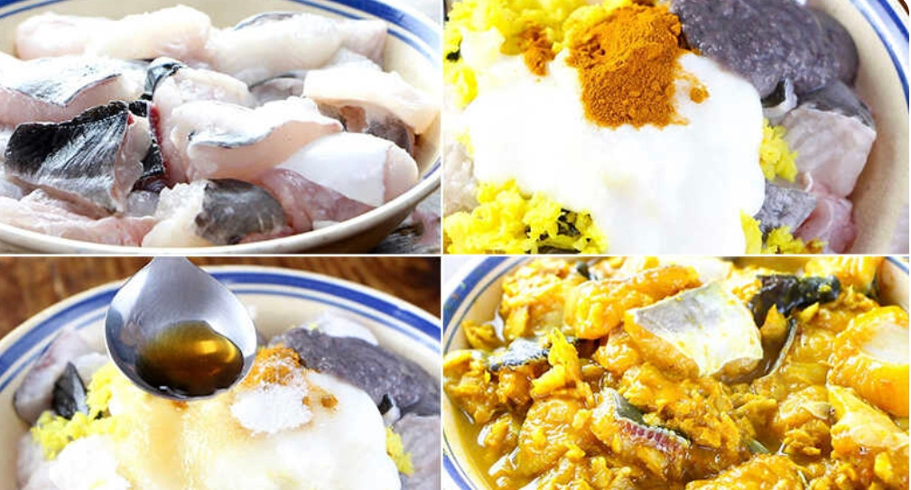 생선 재워두기: 라임즙과 소금을 사용하여 생선을 깨끗이 씻어 물기를 빼준다. 그런 다음 한입 크기로 잘라 다진 갈랑갈, 쌀죽, 맘똠, 강황 가루, 설탕, 피시 소스를 적당량 넣어 1시간가량 재워둔다.