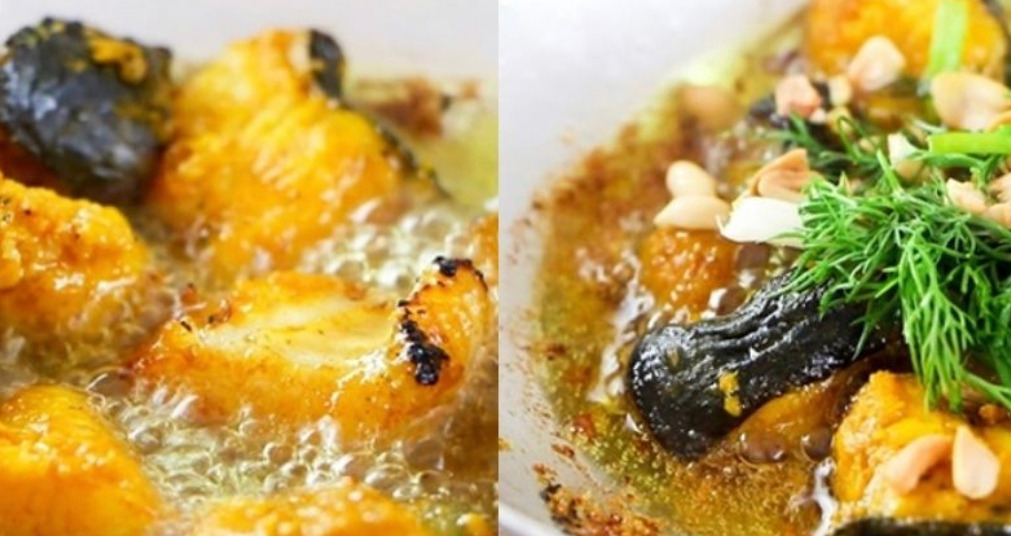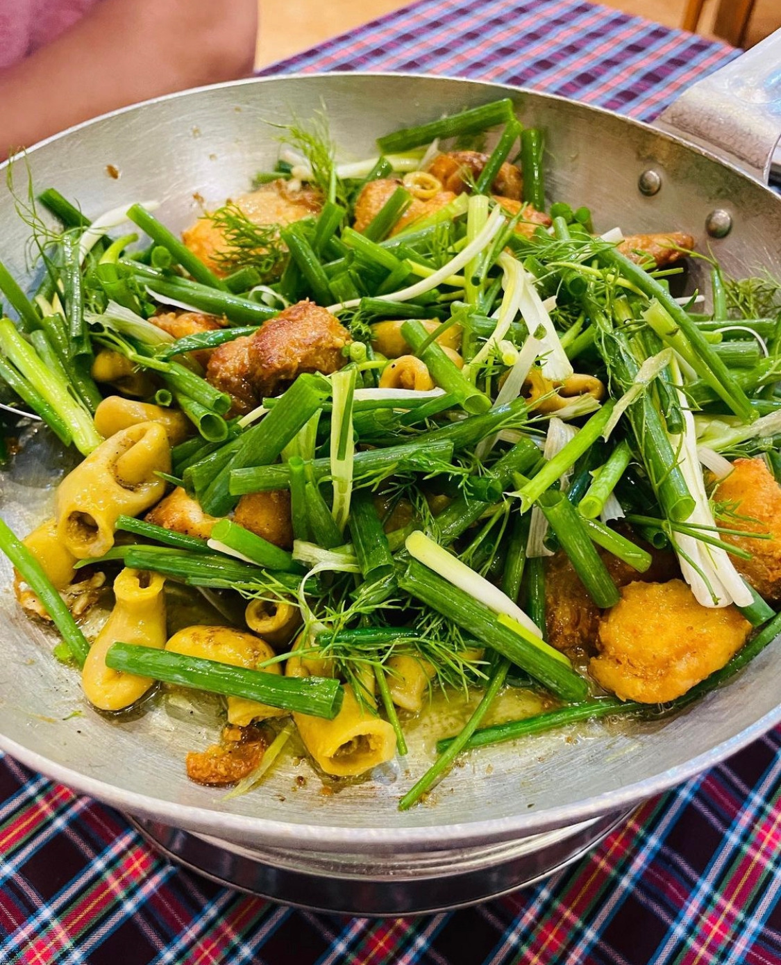 팬에 마늘 오일을 넉넉히 두른 후 쪽파와 딜을 잘게 썰어 바닥에 깔고 튀긴 생선을 올린 뒤 화로에서 빠르게 다시 한 번 볶아내어 촉촉해진 쪽파와 딜을 곁들여 맛있게 먹는다.