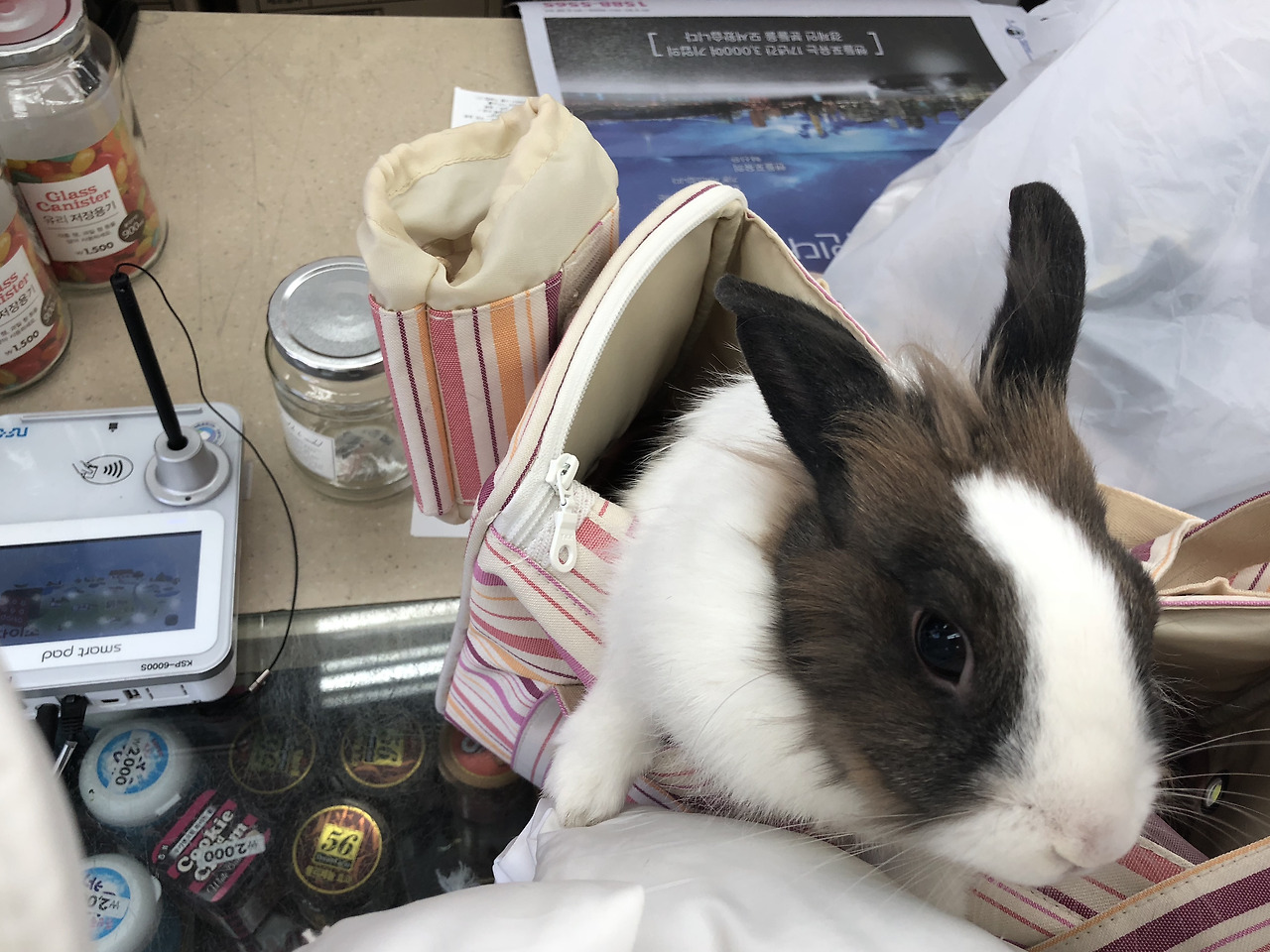 어느 날 마트를 데려갔는데, 잠깐 계산하느라 옆쪽으로 내려놓으니 내 뒤에 서 있던 아주머니가 “에구머니나, 토끼예요? 토끼?” 엄청나게 큰 목소리로 호들갑을 떠시며 토끼인 줄 알면서도 재차 확인을 하며 되물었다.