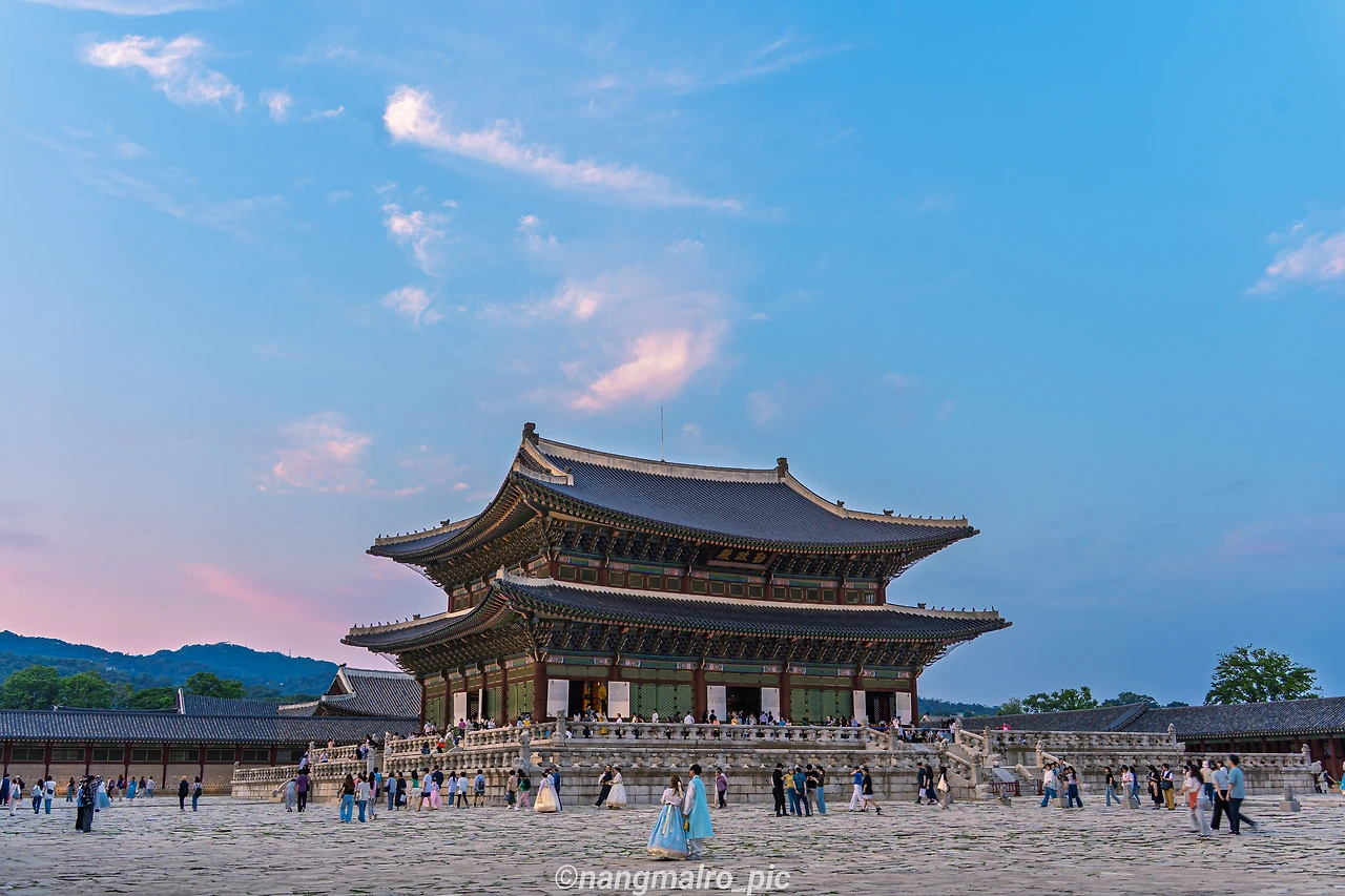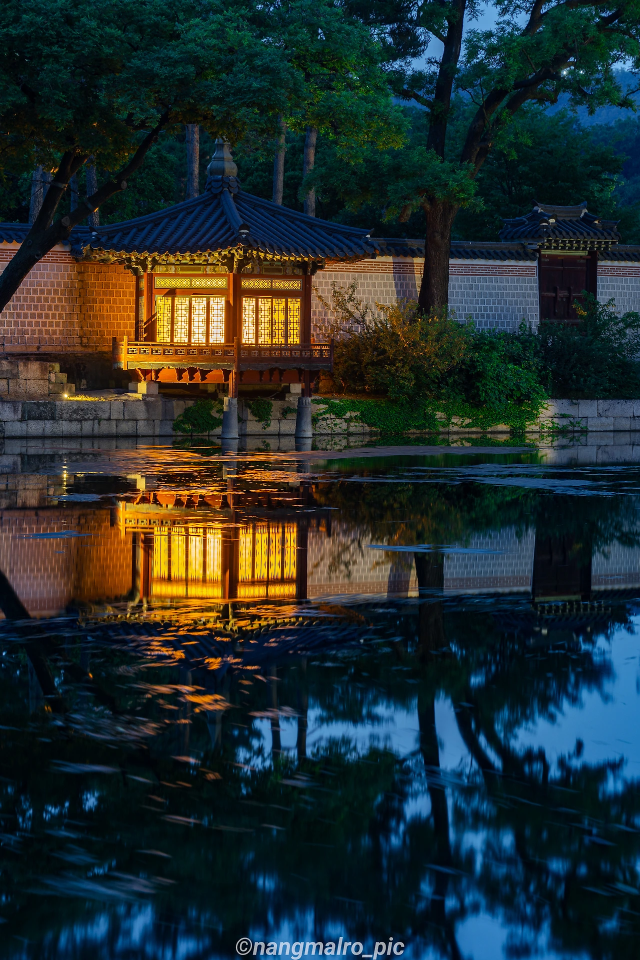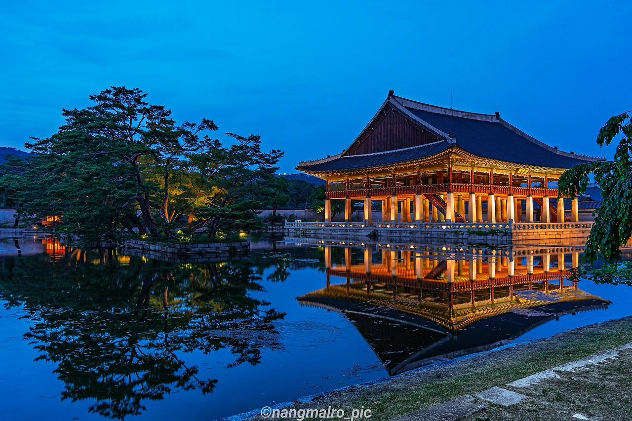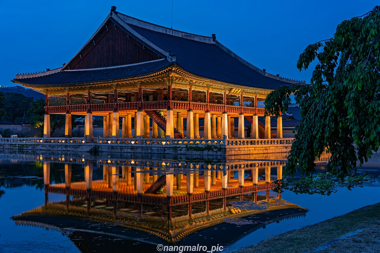 경복궁 야경은 전에 찍었어서 이 날은 경회루 야경을 목표로 잡았다. 경회루로 넘어가기 전에 경복궁을 살짝 담기로 했다. 살짝 푸르고 노란빛 섞이는 하늘이 함께 있는 경복궁을 찍기 위해 삼각대를 설치하고 기다렸다. 옆에 카메라를 들고 사진 찍으러 오신 어르신 두 분과도 대화를 나눴다. 말씀도 되게 부드러우셨고 세대를 뛰어넘어 사진으로 많은 소통을 했다. 찍은 사진도 보여주시면서 전국 각지 사진 찍기 좋은 장소도 많이 알려주셨다. 카메라 세팅을 어려워하시는 한 분이 계셔서 세팅도 도와드렸다.