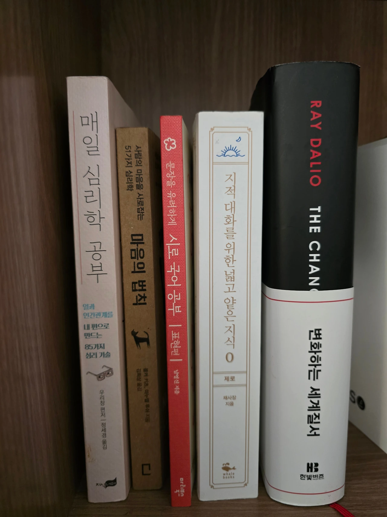두 번째 사진에서 "매일 심리학 공부" 이 책을 대학교 때 깊게 읽어본 후로 책에 조금 흥미를 느꼈다가 금세 다시 꺼져버렸고 이후에 유명 소설인 "돌이킬 수 없는 약속"을 읽었었다. 크으...당시에 너무 재밌어서 하루 만에 다 읽은 기억이 난다. 그러고 나서 20대 중반 막바지에 접어들고 나서야 책을 몇 권 사서 읽기 시작했다. 두 권의 시집과 산문집이 더 있었는데 ( 나태주, 문상훈 작가 책 ) 그 책들은 다른 사람에게 읽어보라고 줘서 없다.