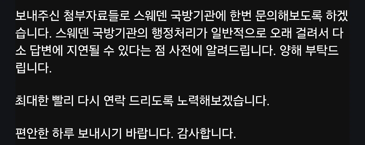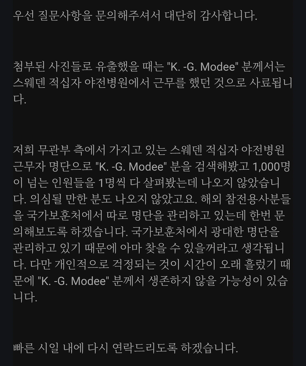 시간이 좀 지나 중간 연락이 왔습니다. 국가보훈처에 문의해 본 결과 이름이 정확하지 않아서 확인이 불가하지만 스웨덴 국방기관에 물어보겠다는 행정원님의 연락이었습니다.