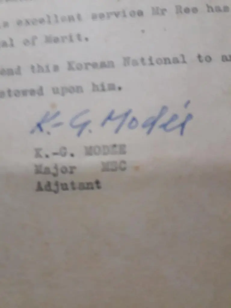 지금 앞에 적은 내용들은 2019년에 전혀 자세히 알지 못한 내용들이었고 단순히 어떤 장교분께서 도움을 주셨다고만 들었습니다. 모디에라는 성함도 제대로 몰랐습니다. 가진 건 단순히 할아버지가 그동안 간직하신 사진 두 장뿐이었죠. 사진에 적힌 Modee, 처음에는 성함을 모디로 인식하고 메일을 보냈습니다.
