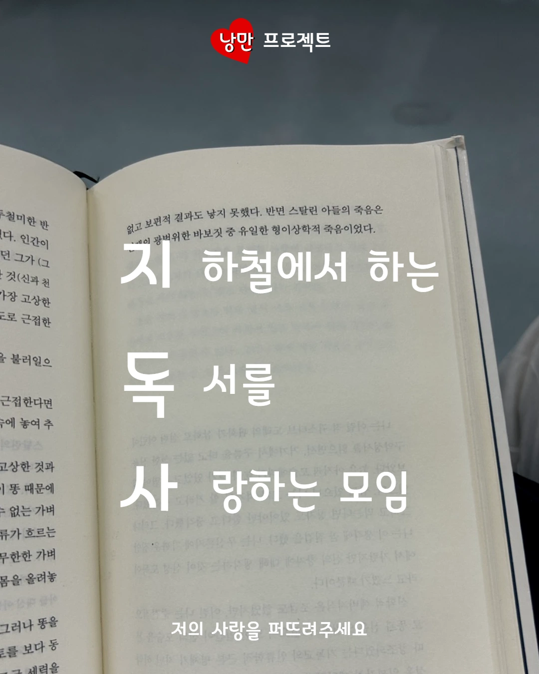 우리 모두 지하철 독서를 사랑해보자. 그것도 아주 지독하게 말이다. 언젠가 지하철에서 책을 읽고 있는 당신을 발견하고 내가 당신에게 지.독.사 편지를 줄 그날을 기다리며 ..