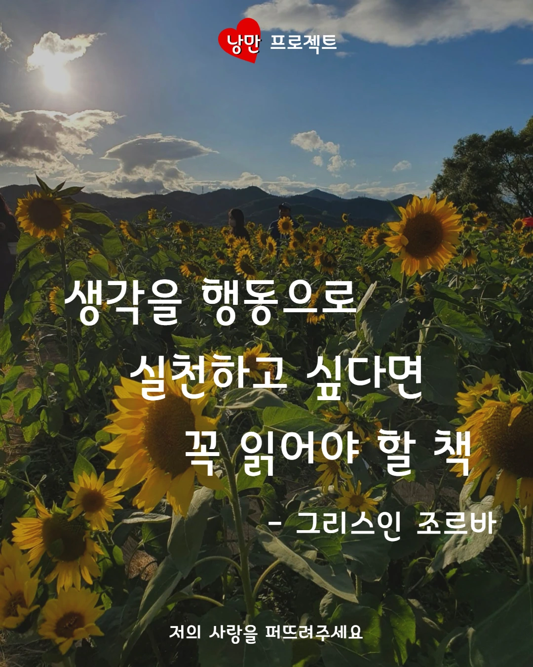 그렇게 나는 실제로 그 가치들을 행하게 되었다. 그 가치는 사랑과 낭만의 가치였고 나는 그것을 실행하여 <낭만 프로젝트>를 시작하게 되었다. 길거리에 가서 사람들에게 낭만에 대해서 물어보고 인터뷰를 하였다. 조르바가 준 용기가 아니었다면 나는 절대 이것들을 할 수 없었을 것이다. 나는 또 한 번 책이 우리에게 주는 커다란 힘에 대해서 놀라지 않을 수가 없다. 만약 당신도 주저하는 행동들이 분명하게 존재한다면, 이 책은 꼭 읽어봤으면 한다. 조르바가 당신에게 용기를 불러일으킬지도 모르니 말이다.