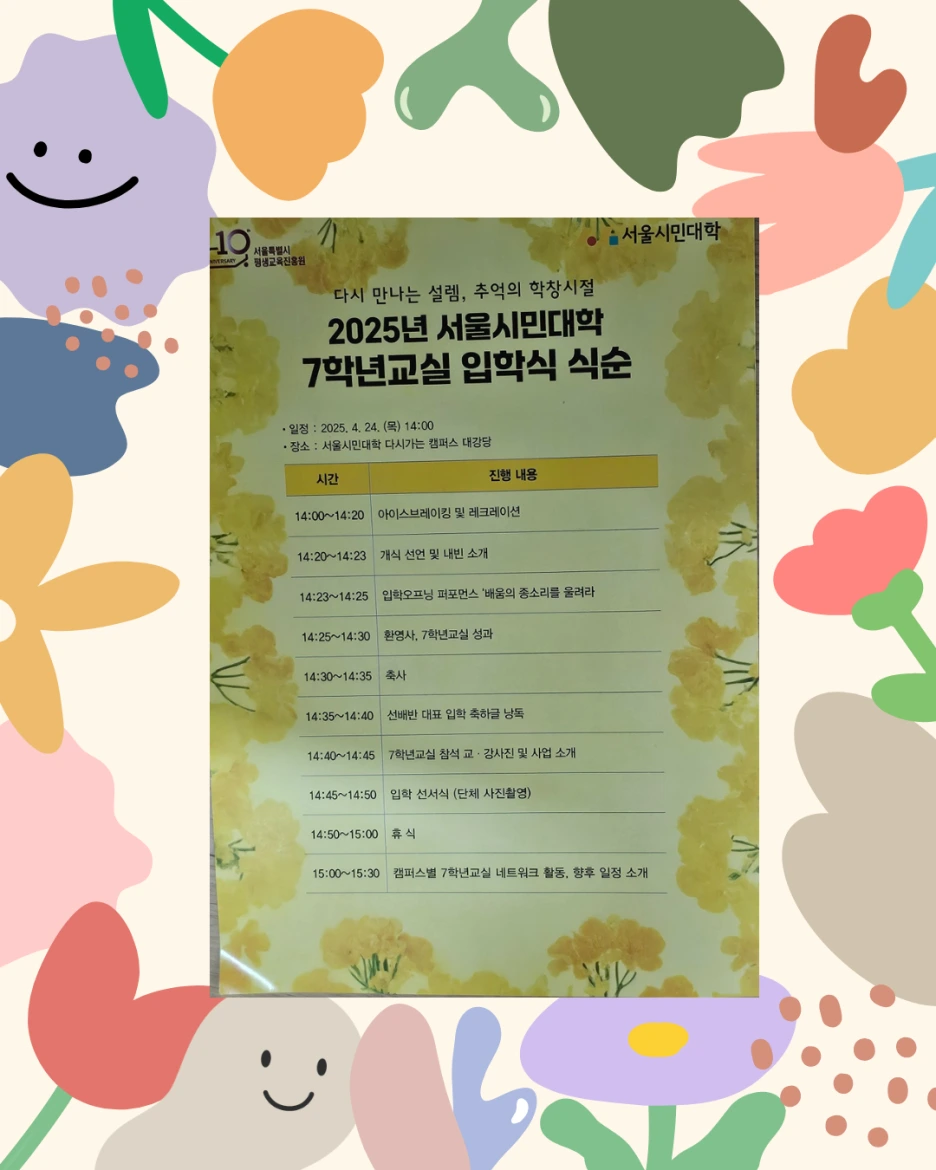 2025년 4월 24일 목요일 오후 2시, 저는 서울시민대학 ‘7학년교실 입학식’에 교강사 자격으로 참석하게 되었습니다.