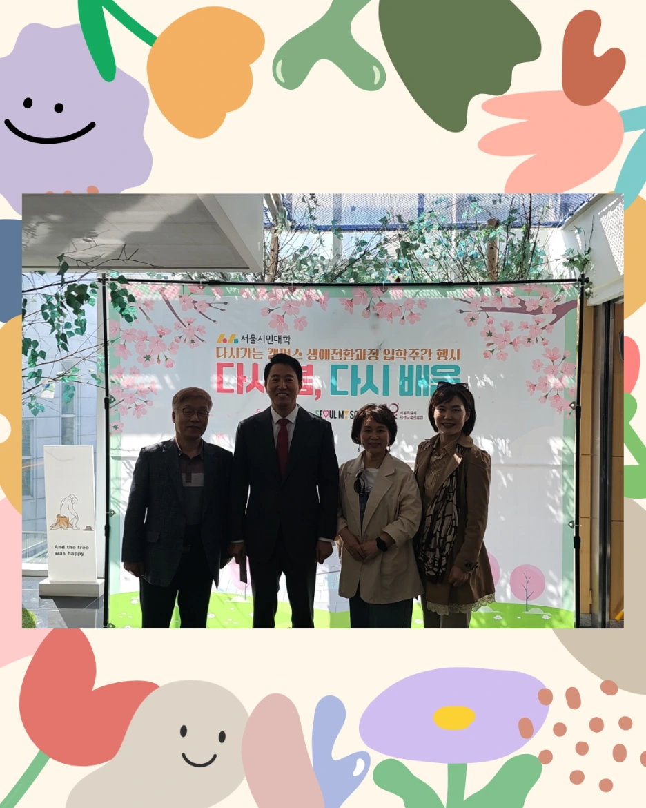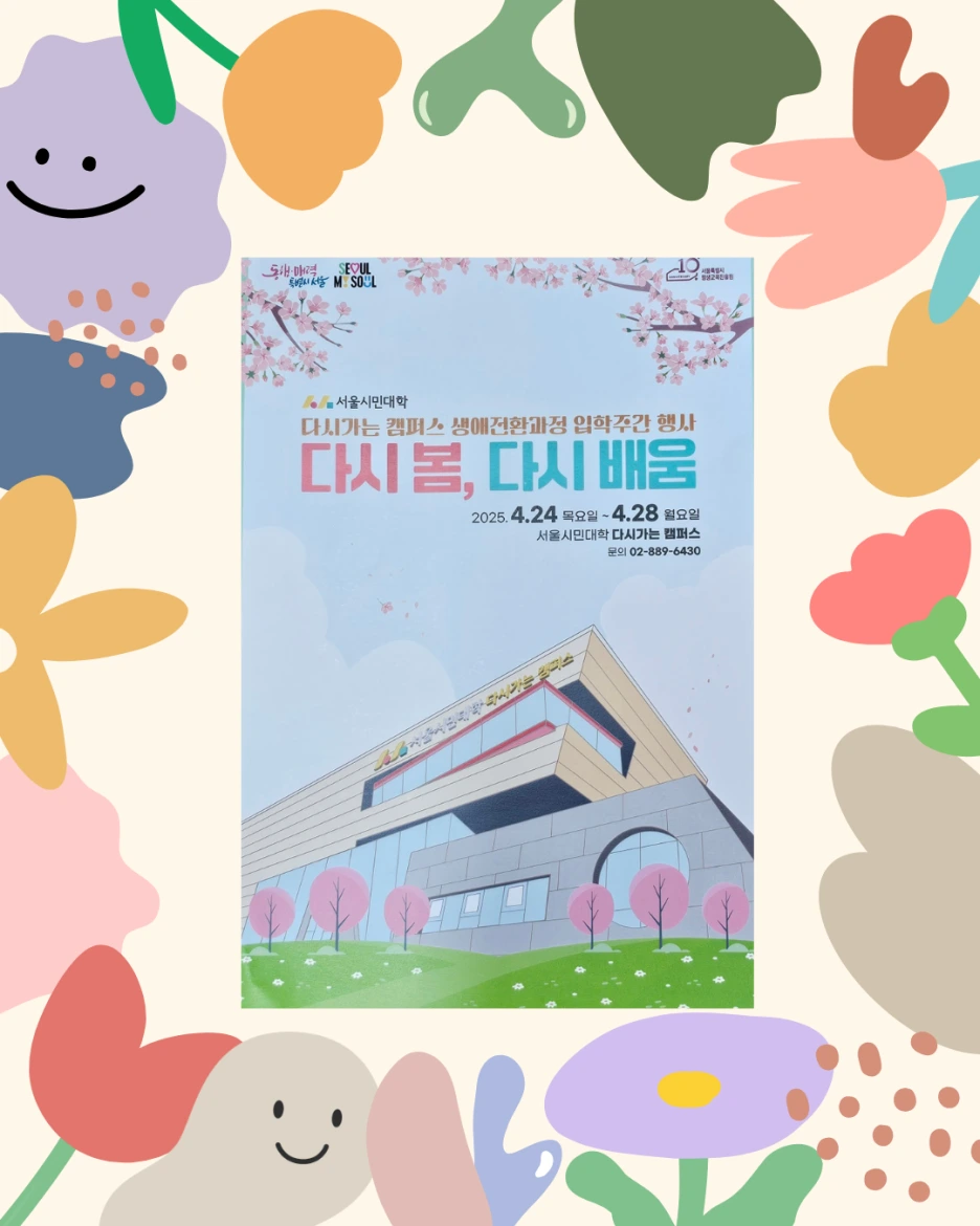 이번 행사는 ‘다시 봄, 다시 배움’이라는 슬로건처럼, 인생의 새로운 배움의 시작을 축하하는 자리였습니다. 장소는 서울시민대학 다시 가는 캠퍼스. 처음 도착한 캠퍼스 건물은 참으로 웅장하면서도 환대의 기운이 가득했어요.
