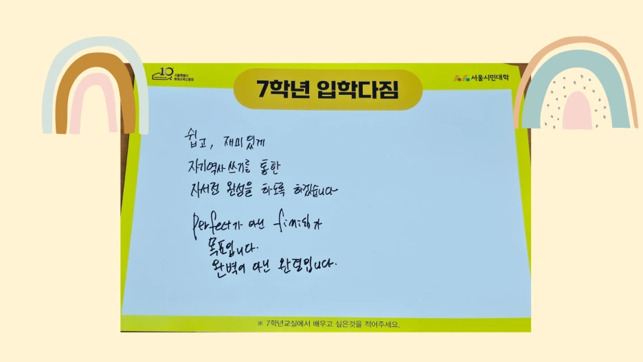 입학생뿐만 아니라 교강사도, 그리고 오세훈 시장님도 한 장씩 다짐을 남기셨죠.