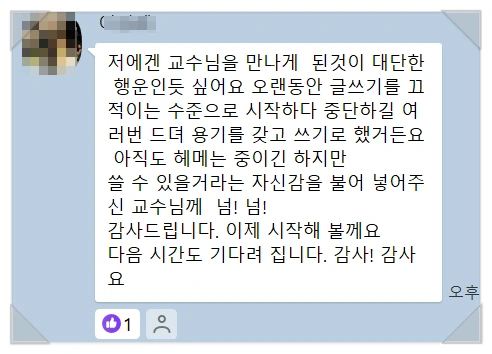 그렇게 다정한 대답들이 오가고, 잠시 정적이 흐른 후 늦게 단톡방에 합류하신 수강생 한 분이 손을 번쩍 드셨습니다.