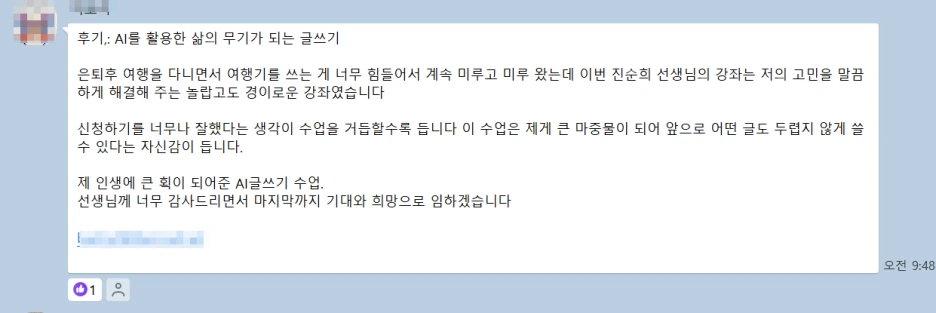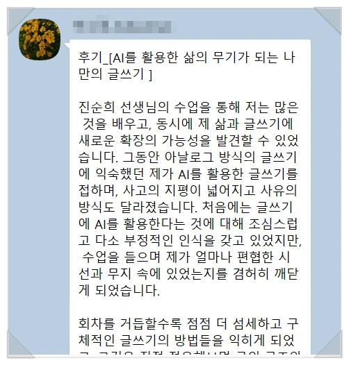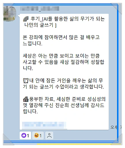 제 인생에 큰 획이 되어준 AI글쓰기 수업. 선생님께 너무 감사드리면서 마지막까지 기대와 희망으로 임하겠습니다