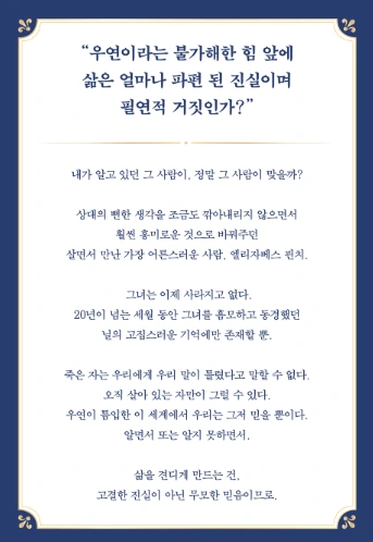 우리는 엘리자베스 핀치를 완전히 알 수 없다. 하지만 그녀를 이해하고자 고군분투한 닐의 여정 속에서, 결국 우리 자신을 더 깊이 들여다보게 된다. 이해는 완성이 아니라 과정이며, 타인뿐 아니라 ‘나’와 관계 맺는 유일한 길이다.