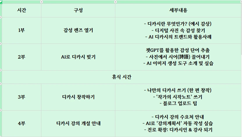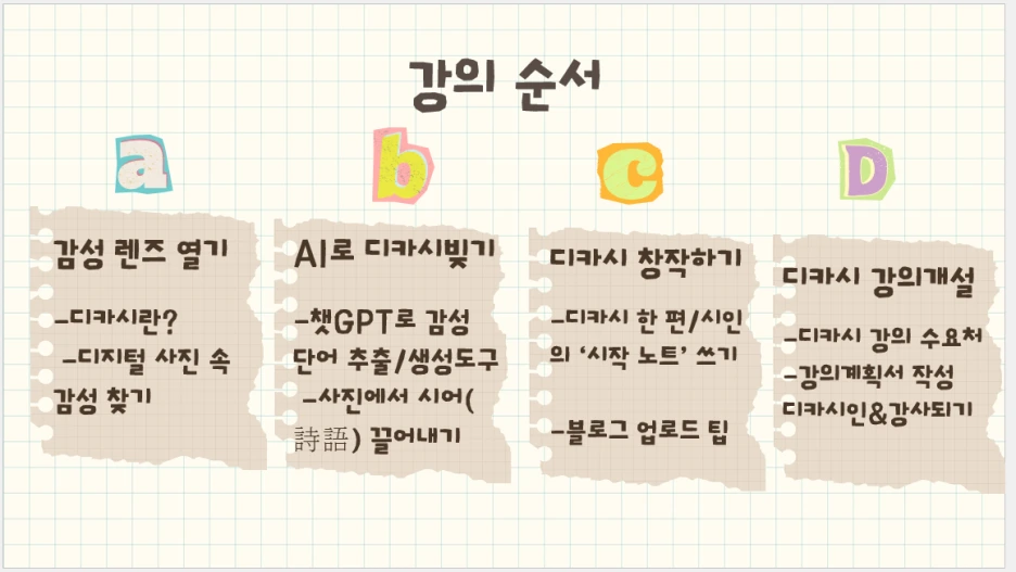 “사진 한 장에서 디카시를 짓는 방법”뿐 아니라 “어떻게 AI에게 효율적으로 물어야 강의제안서가 자동 완성되는지”까지 두 가지 경험을 동시에 선사하고 싶었습니다.