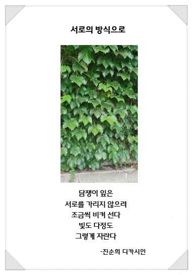 #서로의방식으로 #비켜선다는것 #진순희디카시인 #AI콘텐츠크리에이터 #프롬프트엔지니어#한국책쓰기코칭협회 #출판지도사 #디카시AI코칭지도사 #AI아트코칭지도사 #생성형AI융합교육지도사 #종이책코칭지도사 #전자책출간지도사 #자서전출간지도사 #책놀이지도사 #시니어책놀이지도사 #자기주도학습진로코칭지도사 #경제금융교육지도사