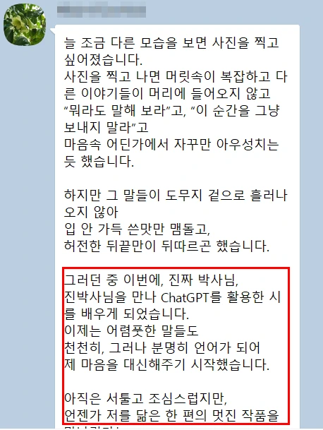 창작이 막막한 이유는 ‘내가 쓴 문장이 괜찮은지 모르겠다’는 불안 때문입니다. AI를 활용한 <디카시 전문가 마스터 코스>, 이 과정에서는 생성형 AI(ChatGPT 등)를 협력자로 두고, 표현 제안, 감정 보완, 구조 피드백을 통해 혼자보다 훨씬 빠르게, 깊이 있게 창작할 수 있습니다.