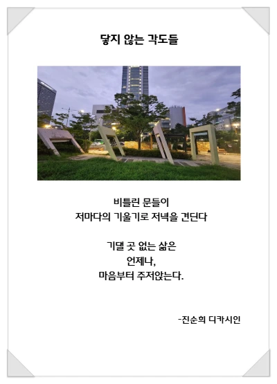 #닿지 않는 각도들 #기대지못하는마음들 #진순희디카시인 #AI콘텐츠크리에이터 #프롬프트엔지니어#한국책쓰기코칭협회 #출판지도사 #디카시AI코칭지도사 #AI아트코칭지도사 #생성형AI융합교육지도사 #종이책코칭지도사 #전자책출간지도사 #자서전출간지도사 #책놀이지도사 #시니어책놀이지도사 #자기주도학습진로코칭지도사 #경제금융교육지도사