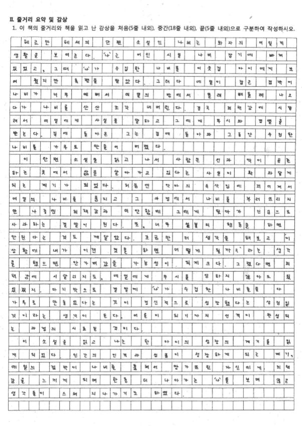 책의 줄거리와 책을 읽고 난 감상을 처음(5줄 내외), 중간(18줄 내외), 끝(5줄 내외)으로 구분하여 작성한다.
