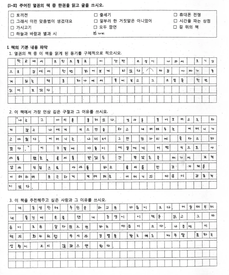 최근에는 써내는 형식이 바뀌었지만 예전에 쓰던 형식이 아이들이 독후감 쓰기에 수월해서 즐겨 사용하고 있다. 최근 몇 년 전까지도 썼던 형식은 아래와 같다.