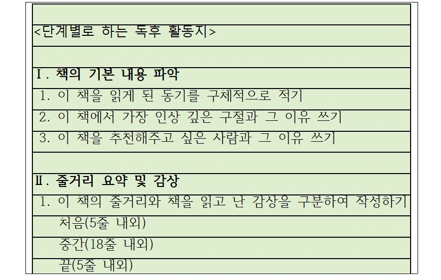 글을 안 써본 친구들은 처음부터 완결된 독후감을 써내는 것에 두려움을 갖고 있다. 사실 글을 잘 쓰는 학생들도 글 쓰는 것에 부담을 갖고 있기는 마찬가지이다. 그래서 생각해 낸 것이 몇 년 전 학교에서 나눠줬던 독후활동지였다. 독후활동지에 소개된 것처럼 단계별로 써보게 했다. 크게 총 두 단계로 구분 되어 있고 각 항목마다 또 작은 항목으로 나눠줘 있다. 이처럼 글쓰기도 스몰스텝으로 작게 여러 단계를 거쳐서 쓰면 어렵지 않게 한 편의 글을 써낼 수 있다.