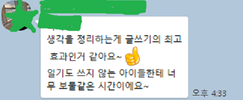 "생각을 정리하는 게 글쓰기의 최고 효과인 거 같아요. 일기도 쓰지 않는 아이들한테 너무 보물같은 시간" 이라는 카톡이 왔다.