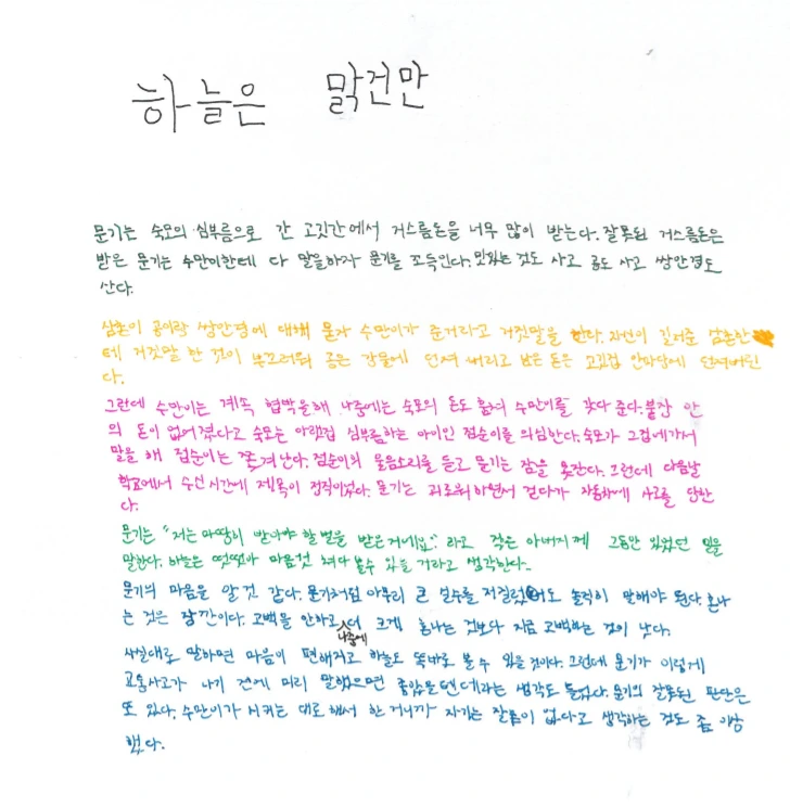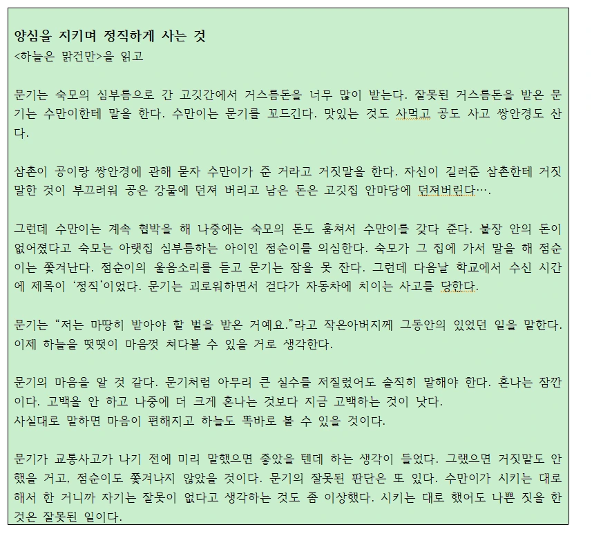 생각이 뚜렷해서 말을 하거나 글을 쓸 때 창의적인 답변을 곧잘 해 가르치는 사람을 기대하게 만든다. <하늘은 맑건만>은 짧아서 그런지 몇 번씩 읽었다고 했다.